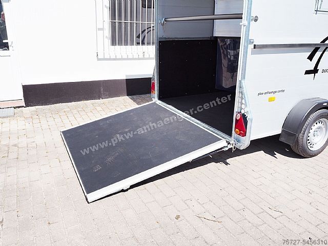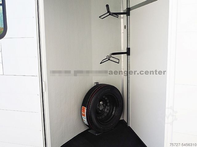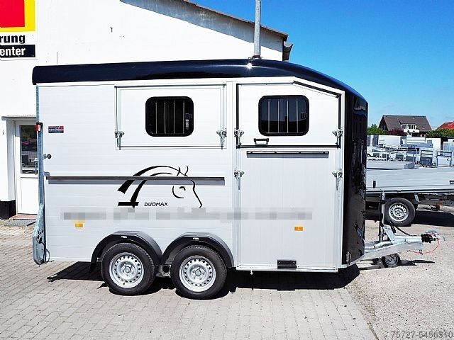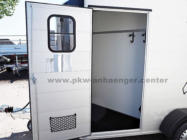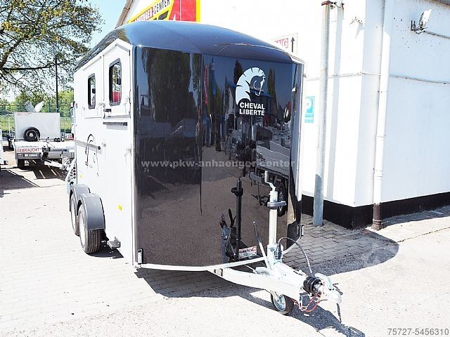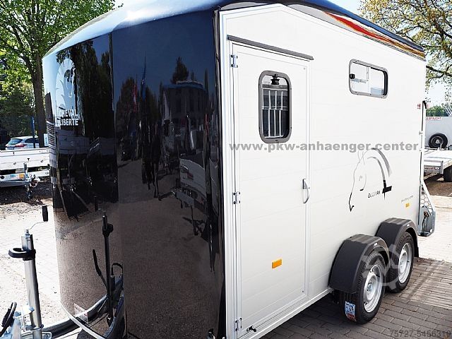 The two-horse trailer is equipped with an inclined position, partition wall with belt and privacy screen, front exit, huge tack room, poly hood available in various colors, aluminum walls, aluminum floor, entrance door, flap and door system, Pullman chassis-2, 100km/h, interior light, automatic support wheel, sliding window, spare wheel, stable frame, V-drawbar and so on.