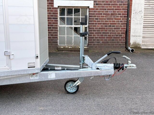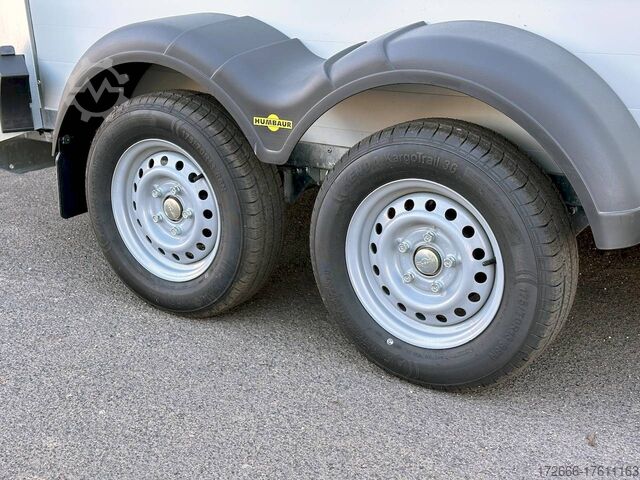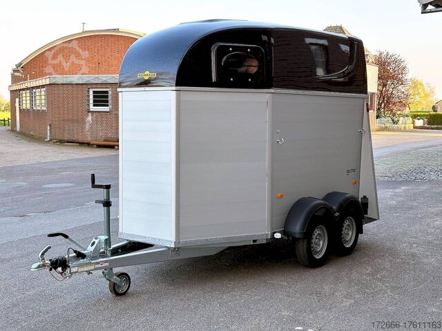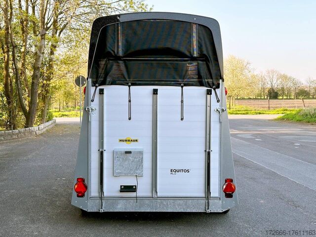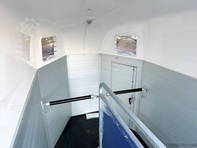 Hydraulics, automatic reversing, hot-dip galvanizing, * IMMEDIATELY AVAILABLE * Technical data: - Type: New vehicle - TÜV: New/2 years - Availability: IMMEDIATELY! - Number of animals: 2 - Permissible total weight: 2,000 kg - Unladen weight: 800 kg - Payload: 1,200 kg - Interior dimensions: 315 x 165 x 230 cm (LxWxH) - Overall exterior dimensions: 460 x 220 x 280 cm (LxWxH) - Tires: 175/70R13 steel rim - Brake: yes - Support wheel: yes - Automatic with comfort handle - 100 km/h: at extra charge - incl. vehicle documents Vehicle body: - Floor: Aluminum BiComp floor 21 mm - Side walls/body: Aluminium anodized double-walled - Roof material: full polyester - Colour: black - Tack room: no - Tack room equipment: -- - Feed troughs: yes, loose - Chassis: EquiDrive® chassis prepared for 100km/h - Height of stall bars: 105 cm - Distance between stall bars: 179 to 189cm, adjustable - Baumann trailer - Tailgate material: approx. 1000kg load capacity, rubber covered anti-slip - Tailgate function: standard tailgate - Drainage flap: no - Overrun device & brake: KNOTT - Lighting plug: 13-pin - Approval: COC papers, approval with green license plate possible for sports purposes Standard equipment: - EquiDrive® chassis - Preparation for wheel shock absorbers - 13-pin plug with reversing and fog lights - Alu-BiComp floor 21 mm - Rubber floor 8 mm thick glued in and sealed - Body made of double-walled, anodized aluminium profiles - Solid, galvanized frame profile - Elegant, galvanized rear rear support with integrated lighting - Large access door with 3-point locking - Access hatch with rubber granulate mat - Divided breast and rear bars, Tinted opening windows in poly hood - Interior lighting and hay net ring - Automatic support wheel mounted in the middle with maneuvering handle - Poly hood in tent grey - Exclusive wind deflector for draught-free interior ventilation - Tires suitable for 100 km/h (only in Germany) - Tethering option outside - Tethering option inside Inside tethering option - Padded safety stall pole system - Divided stall poles with plastic protection - Depth adjustment for stall poles - PVC transparent partition wall - Front and rear panic release - Lockable access door - Door retainer on access door - Tinted and hinged windows - Tandem mudguards, Tandem mudguards, plastic (black) - Lifting device gas pressure shock absorber on tailgate - Step on rear tailgate Accessories can be retrofitted - please enquire: - Wheel shock absorber with 100km/H approval - Inner side step protection, black plastic - Inner side padding - Spare wheel with holder - Spare wheel cover - Cover for automatic jockey wheel - Anti-sway hitch - Weight reduction to different total weight - Aluminum rims - Approach mirror - Climbing aid - Storage bracket for saddle (KTL-coated) - Additional interior light - Foal grille - Feed trough for hanging with holder - Chest bar padding - Box bar continuous, padded (rear) - Full-length, padded stall rail (front) - Wear mat/scratch mat - Video surveillance system incl. reversing camera New vehicle with warranty and TÜV. We are happy to offer you suitable financing !, Descriptions and pictures are protected by copyright !!! Over 800 trailers immediately available for you! For more than 30 years we are Brian James / Humbaur / Hapert / Unsinn / Cheval Liberte / Koch / Debon / Stedele / TPV / Tohaco / Vezeko / Variant / Vlemmix - Specialized dealer & Repair - Workshop - Delivery