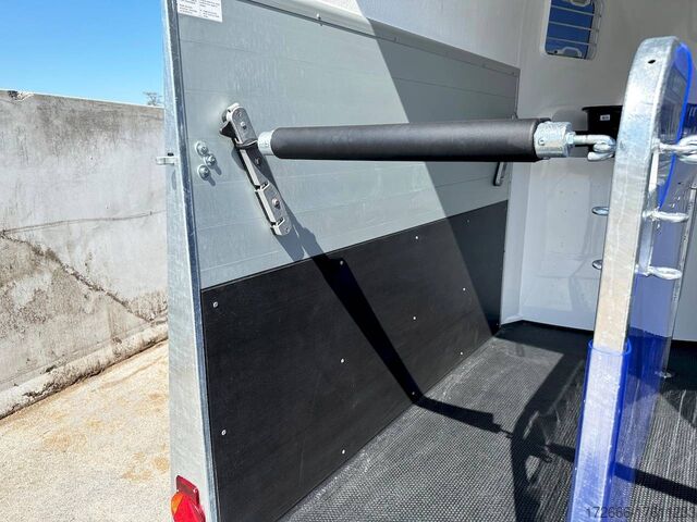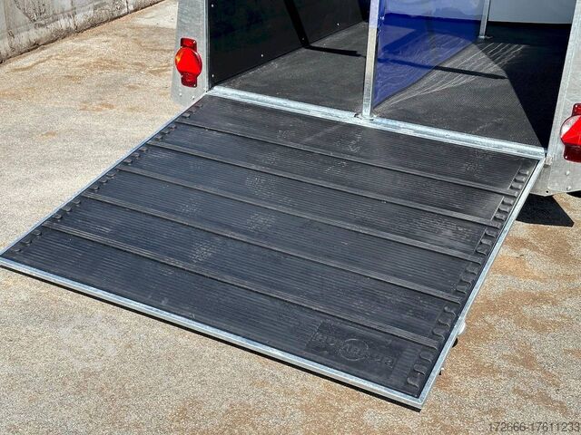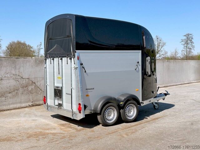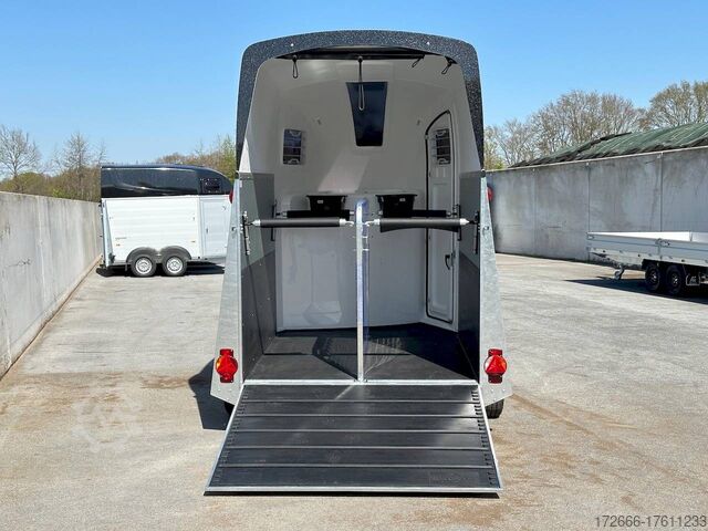 Hydraulics, automatic reverse drive, hot-dip galvanizing, * IMMEDIATELY AVAILABLE * Technical data: - Type: New vehicle - TÜV: New/2 years - Availability: IMMEDIATELY! - Number of animals: 2 - Gross vehicle weight: 2,400 kg - Unladen weight: 910 kg - Payload: 1,490 kg - Interior dimensions: 346 x 171 x 237 cm (LxWxH) - Overall exterior dimensions: 459 x 224 x 296 cm (LxWxH) - Tires: 195/65R15 steel rim - Brake: yes - Support wheel: yes - Automatic with comfort handle - 100km/h: INCLUDED! - incl. vehicle documents Vehicle body: - Floor: Aluminum BiComp floor 21 mm - Side walls/body: Anodized double-walled aluminium - Roof material: Full polyester - Colour: Black metallic - Tack room: Yes - Tack room equipment: Luggage net, saddle holder, make-up mirror, bridle holder, lockable door, door lock - Feed troughs: Yes, removable from tack room - Chassis: EquiDrive® running gear with wheel shock absorbers - Height of stall bars: 95 to 115 cm, adjustable - Distance between stall bars: 161 to 181 cm, adjustable - Distance between tack room and breast bar: outside 35 cm / with partition wall: 50 cm - Tailgate material: approx. 1000 kg load capacity, rubber-covered incl. Tailgate function: standard tailgate - Drain flap: no - Overrun device & brake: KNOTT - Lighting plug: 13-pin - Approval: COC papers, approval with green license plate possible for sporting purposes Standard equipment: - EquiDrive® chassis with wheel shock absorber - AERO-dynamic shape - Body made of double-walled, anodized aluminium profiles - Side step protection - 13-pin plug with reversing and fog light - AluBiComp floor plate, 21 mm thick - Rubber floor, 8 mm thick, glued in and sealed - Solid, all-round and hot-dip galvanized frame profile - Elegant, hot-dip galvanized rear supports with integrated lighting - Entrance with 3-point locking - Access hatch with rubber tread strip and side stop - Lockable tack room with pull-out saddle holder, bridle holder, mirror, net, interior lighting, shovel and brush - Man-high entrance door with 3-point locking - EquiLock® lockable partition wall - Tinted hinged windows in new design, 5-way adjustable - Interior lighting and hay net ring - Exclusive wind deflector for draught-free interior ventilation - Automatic jockey wheel, 100 km/h confirmation (only for Germany) - EquiGuard new safety stall bars - EquiGuard panic release front and rear - Depth adjustment for stall bars - Height-adjustable stall bars - PVC transparent partition wall - Lockable access door - Door retainer on access door - Tinted and hinged windows - Tandem mudguards, (black) - Lifting device gas pressure shock absorber on tailgate - Step on rear flap New vehicle with warranty and TÜV. We are happy to offer you suitable financing !, Descriptions and pictures are protected by copyright !!! Over 800 trailers immediately available for you! We are for over 30 years Brian James / Humbaur / Hapert / Unsinn / Cheval Liberte / Koch / Debon / Stedele / TPV / Tohaco / Vezeko / Variant / Vlemmix - specialized dealer & repair - workshop - delivery Germany-wide with surcharge possible! Anhänger Zentrum BAUMANN GmbH Dinxperloer Str. 389 46399 Bocholt - Errors, omissions and prior sale excepted -