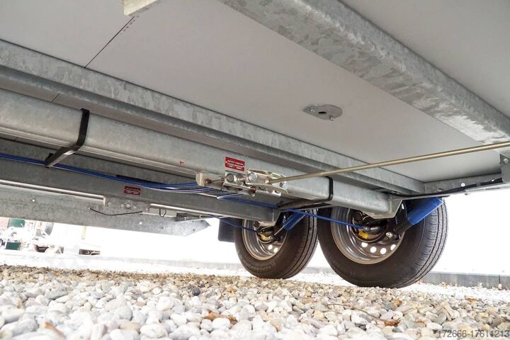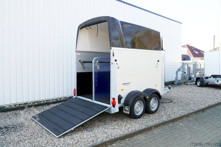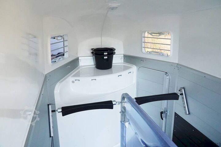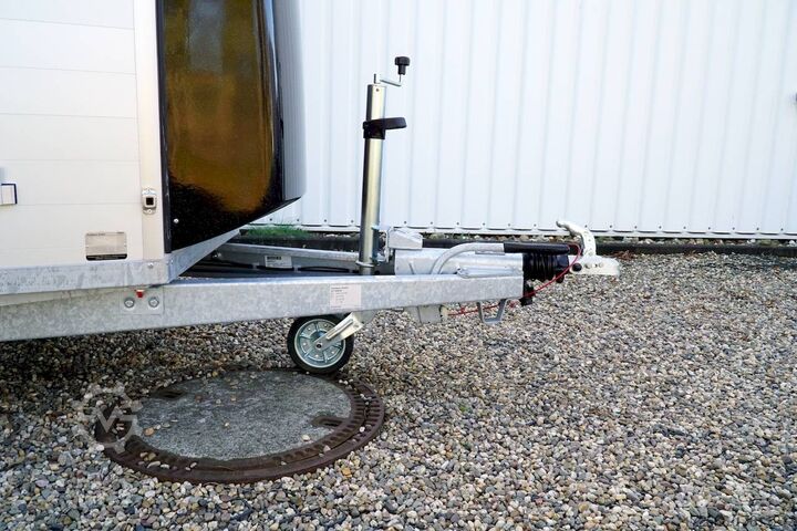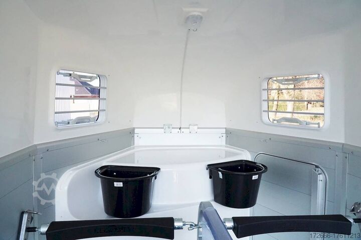 Hydraulics, automatic reverse drive, hot-dip galvanizing, * IMMEDIATELY AVAILABLE * Technical data: - Type: New vehicle - TÜV: New/2 years - Availability: IMMEDIATELY! - Number of animals: 2 - Gross vehicle weight: 2,400 kg - Unladen weight: 875 kg - Payload: 1,525 kg - Interior dimensions: 344 x 171 x 236 cm (LxWxH) - Overall exterior dimensions: 459 x 224 x 288 cm (LxWxH) - Tires: 195/65R15 steel rim - Brake: yes - Support wheel: yes - Automatic with comfort handle - 100km/h: INCLUDED! - incl. vehicle documents Vehicle body: - Floor: Aluminum BiComp floor 21 mm - Side walls/body: Anodized double-walled aluminium - Roof material: full polyester - Colour: black - Tack room: yes - Tack room equipment: luggage net, saddle holder, make-up mirror, bridle holder, lockable door, door lock - Feed troughs: yes, removable from tack room - Chassis: EquiDrive® chassis with wheel shock absorber (100km/h) - Tailgate material: approx. 1000kg load capacity, rubber-covered incl. step bars - Tailgate material: approx. 1000kg load capacity, rubber-covered incl. step bars - Comfort handle, incl. vehicle documents! Tailgate function: standard tailgate - Drain flap: no - Overrun hitch & brake: KNOTT - Lighting plug: 13-pin Standard equipment: - EquiDrive® chassis with wheel shock absorber - AERO-dynamic front - Body made of double-walled, anodized aluminium profiles - Side step protection - 13-pin plug with reversing and fog light - AluBiComp floor plate, 21 mm thick - Rubber floor, 8 mm thick, glued in and sealed - Solid, all-round and hot-dip galvanized frame profile - Elegant, hot-dip galvanized rear supports with integrated lighting - Entrance with 3-point locking - Overrun flap with rubber tread strip and side stop - Divided and padded breast and rear bars, height and length adjustable, with EquiGuard panic release - EquiLock® lockable partition wall - Tinted hinged windows in new design, 5-way adjustable - Interior lighting and hay net ring - Exclusive wind deflector for draught-free interior ventilation - Automatic jockey wheel, 100 km/h confirmation (only for Germany) - Tethering option outside - Tethering option inside - Padded safety stall rail system - EquiGuard new safety stall rails - EquiGuard panic release front and rear - Split stall rails - Depth adjustment for stall rails - Height-adjustable stall rails - PVC transparent partition wall - Lockable access door - Door retainer on access door - Tinted and hinged windows - Tandem mudguards, (black) - Lifting device gas pressure shock absorber on tailgate - Step on rear flap - Tack room inside with: Saddle holder, net, mirror, bridle holder - Pull-out saddle holder Accessories can be retrofitted - please enquire: - Side padding - Spare wheel with holder - Cover for automatic jockey wheel - Weight reduction to different total weight - Aluminum rims - Saddle storage bracket - Additional interior light - Foal grille - Wear mat/scratch mat - Video surveillance system - Anti-theft device New vehicle with warranty and TÜV. We are happy to offer you suitable financing !, Descriptions and pictures are protected by copyright !!! Over 800 trailers immediately available for you! We are for over 30 years Brian James / Humbaur / Hapert / Unsinn / Cheval Liberte / Koch / Debon / Stedele / TPV / Tohaco / Vezeko / Variant / Vlemmix - specialized dealer & repair - workshop - delivery Germany-wide with surcharge possible! Anhänger Zentrum BAUMANN GmbH Dinxperloer Str. 389 46399 Bocholt - Errors, omissions and p