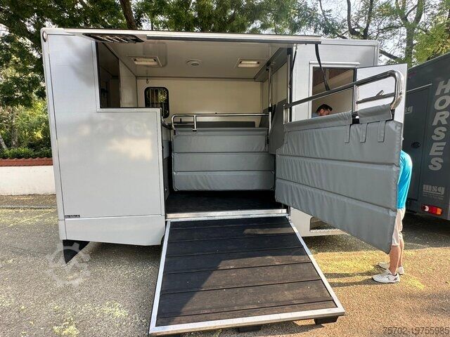 HU/AU new, 2-horse trailer fully insulated box, side ramp, ramp limiter, winch with ramp, 220 V connection, rear door, tack room, saddle holder, roof hatches, windows in the horse compartment, living area with 1 sleeping berth, 1 folding bed, storage cabinets, window in horse compartment, permissible total weight 2,500 kg. FOR US, CONDITION AND GUT FEELING ARE DECISIVE; PRICE IS SECONDARY. For further questions, please contact Mr. Faller at the provided number. //TRADE-IN, PART-EXCHANGE OR PAWN OF YOUR VEHICLE, AS WELL AS FINANCING POSSIBLE! All information provided without guarantee. Further offers can be found on our homepage. The description and stated data do not constitute an assurance and are not binding. The purchase contract concluded at the dealership upon purchase of the vehicle is binding. Errors and prior sale excepted!