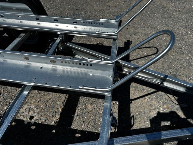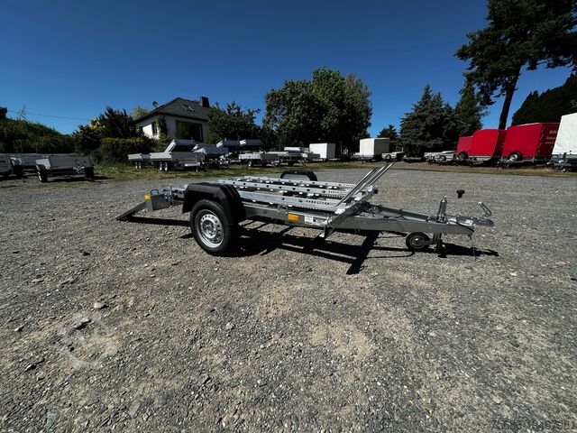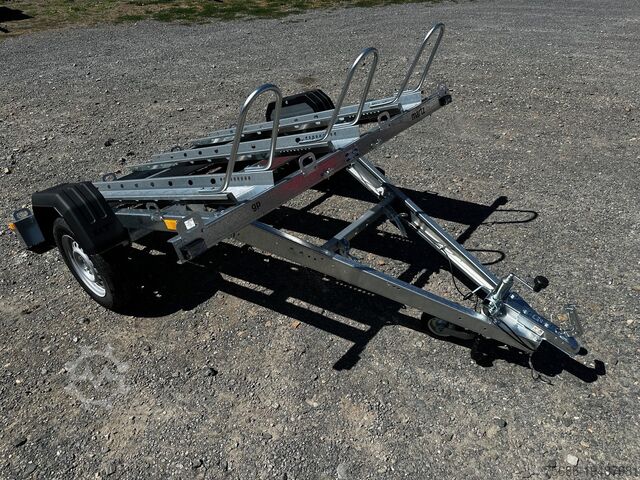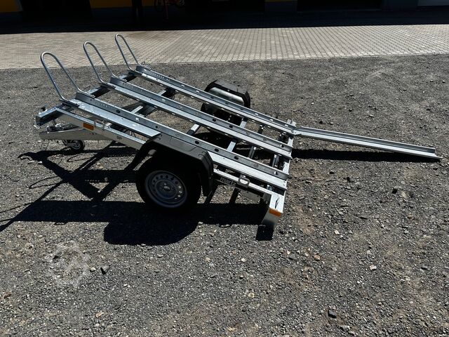 Special trailer for transporting motorcycles with a swiveling drawbar and a loading ramp located beneath the loading area. Support frame made of bent profiles from galvanized sheet steel, bolted with numerous fastening points for tie-down straps. Adjustable grip for securing the motorcycle wheel during transport.