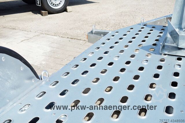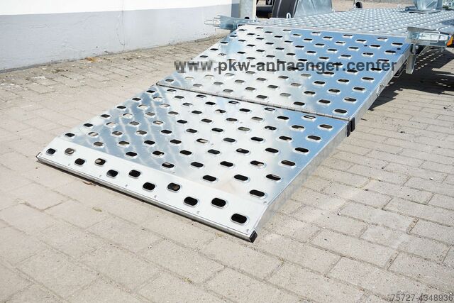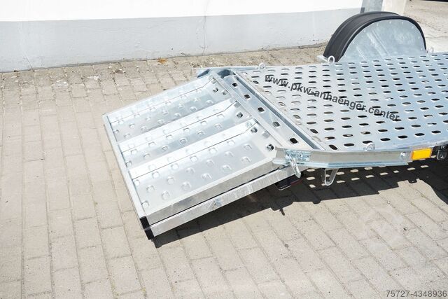 The standard equipment of the motorcycle transporter includes an adjustable motorcycle rocker, perforated profile floor with anti-slip and lashing options, stable ramp flap with perforated profile and support, many lashing eyes, support wheel, stable welded frame hot-dip galvanized and a very stable V-drawbar.