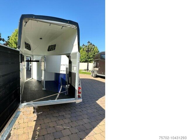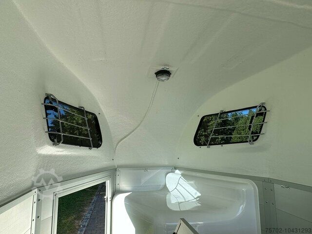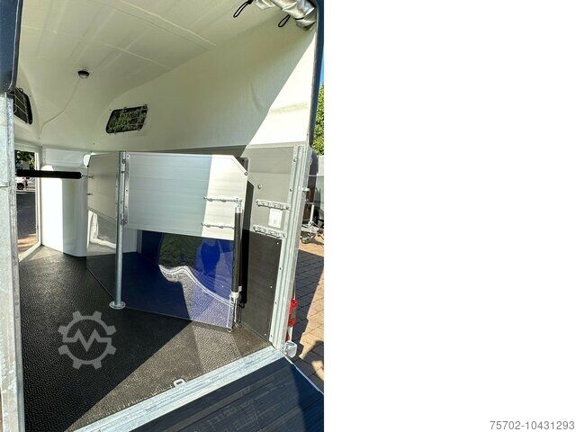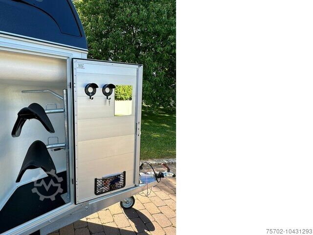 , 2 horses Hood color: Black Metallic Aluminum horse trailer door-ramp combination Kick guard on the outside of the tailgate Tread strips on the ramp Kick guard, plastic Rubber partition wall Hinged window with grille protection Transparent roof hatch Standard entrance door on the left Lockable tack room with two saddle and two bridle holders Interior lighting Box bars adjustable in height and length Aluminum construction with aluminum floor Aluminum floor with 8 mm rubber mat with a linen layer in the middle Interior dimensions 340x171x245 cm Designer fenders, black Automatic rear tarpaulin Winter tarpaulin Automatic support wheel Steel rims 195/65 R15 Permissible total weight 2,500 kg Extras: Increased load to 2,500 kg plus €167.00 net Tack room with Sirius holder plus €780.00 net Divisible partition wall plus €420.00 net Shock absorber plus €188.00 net Chest padding plus €167.00 net FOR US, THE CONDITION AND OUR GUT FEELING ARE DECISIVE, THE PRICE COMES SECOND. Purchase price plus €15.00 net vehicle documents. If you have any further questions, please do not hesitate to contact Mr. Faller on the number. //*EXCHANGE, TRADE-IN OR LOAN FOR YOUR VEHICLE, AS WELL AS FINANCING POSSIBLE!All information without guarantee* You can find further offers on our homepage: The description and data provided do not represent a guarantee and are not binding. The purchase contract that is concluded in the car dealership when purchasing the vehicle is binding. Errors and prior sale reserved!