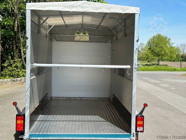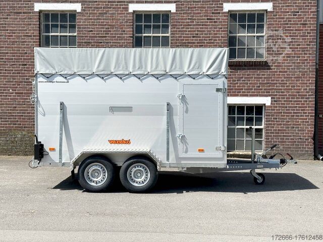 Hydraulics, automatic reverse, hot-dip galvanizing, * IMMEDIATELY AVAILABLE * VEZEKO VT 2000 RAMP/ DOOR COMBI 320X160X190CM VIEHANHÄNGER RAMPENGUMMI LÜFTUNG BOXENSTANGE TECHNICAL DATA: - Make: Vezeko - Model: VT 2000 - Vehicle type: Livestock trailer - Vehicle condition: New vehicle - Initial registration: Without initial registration - TÜV/HU: 2 years from initial registration - Internal dimensions (L x W x H): 320 x 160 x 190 cm - External dimensions (L x W x H): 464 x 205 x 247 cm - Floor loading height: 51 cm - Perm. Total weight: 2,000 kg - Unladen weight: 852 kg - Payload: 1,148 kg - Chassis: Low loader (wheels next to the body) - Tires: 185R14C - Chassis: ALKO rubber spring axle - Support wheel: Yes, automatic - 100 km/h approval: Optional, can be retrofitted EQUIPMENT: - Brake: Yes - Number of axles: 2 - Floor: Aluminium chequer plate trough on wooden multiplex plate - Walls material: Double-walled anodized aluminium - Roof material: Tarpaulin - Number of animals: 2 - Suitable for livestock types: Sheep, goats, small cattle, large cattle, calves, pigs - Overrun device/brake: ALKO - Galvanization: hot-dip galvanized - Drawbar: V-drawbar, bolted, C-profile - Mudguards: steel mudguards - Standing area:5.1 m - Double deck:No - Driving gate: Optionally available - Cross partition inside: Optionally available - Window:Sliding side window, barred - Front exit:No - Rear door / hatch material: aluminum, rubber-covered and kick strips - Interior light: Optional, can be retrofitted - Rear lighting:Incandescent bulbs, lamps recessed in side struts - Side lighting: Rear track marker lights - Plug for lighting: 13-pin - Vehicle documents:COC papers DESCRIPTION: - Folded aluminum checker plate tub, welded to screen-printed wooden floor - Reinforced, sturdy bolted V-drawbar - Very sturdy welded steel frame - Frame compl. hot-dip galvanized - many cross members for high point loading - anodized aluminium walls, double-walled 25 mm - tie-down option, with bar and 3 tie-down rings - access door on the right in the direction of travel with 2 robust angle lever locks - solid, hot-dip galvanized, welded tarpaulin frame - ventilation opening in tarpaulin can be rolled up at the front - 2 side struts for additional stability - ventilation opening one pair, rear portal, continuously welded, hot-dip galvanized in solid design - rear flap with flap - door combination - rubber mat on the loading flap with integrated step strips - box bar can be removed from the rear flap - maintenance-free rubber spring axle from ALKO - automatic reverse drive - ALKO overrun device and parking brake - 13-pin plug - return driving license - ALKO parking brake and parking brake - rear brake - rear parking brake. plug - reversing lights - large safety lights - integrated rear fog light - rear lane departure warning lights - automatic support wheel in the middle - accessories can be retrofitted - please enquire: - 100km/H approval with wheel shock absorber - transverse separation - interior light - reversing lights - storage box New vehicle with warranty and TÜV. We are happy to offer you suitable financing !, Descriptions and pictures are protected by copyright !!! Over 800 trailers immediately available for you! We are for over 30 years Brian James / Humbaur / Hapert / Unsinn / Cheval Liberte / Koch / Debon / Stedele / TPV / Tohaco / Vezeko / Variant / Vlemmix - specialized dealer & repair - workshop - delivery Germany-wide with surcharge possible! Anhänger Zentrum BAUMANN