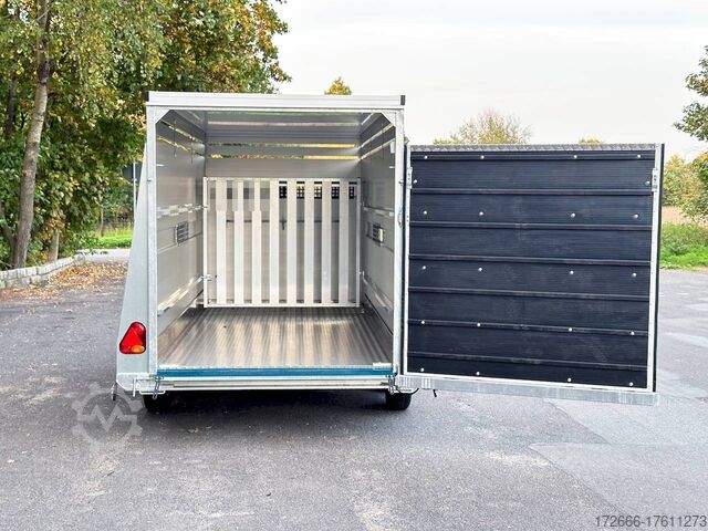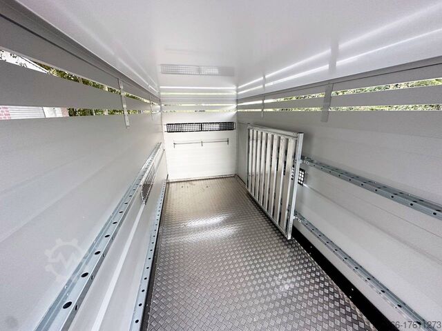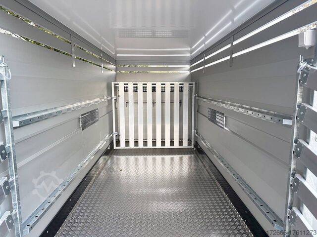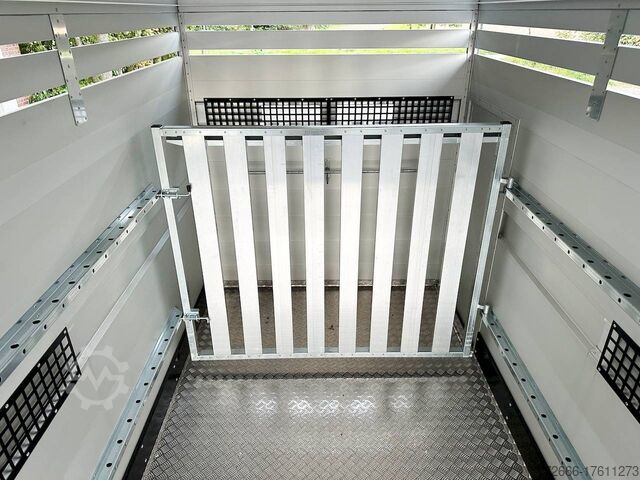 Hydraulics, automatic reverse, hot-dip galvanizing, * IMMEDIATELY AVAILABLE * VEZEKO VT 3500 K-W ALUMINIUM FLOOR RAMP/DOOR COMBINATION CROSS WALL 400X170X188CM VIEHAN HANGER ISO-DACH XL VENTILATION I DRIVE GRID TECHNICAL DATA: - Make: Vezeko - Model: VT 3500 - Vehicle type: Livestock trailer - Vehicle condition: New vehicle - Initial registration: Without initial registration - TÜV/HU: 2 years from initial registration - Internal dimensions (LxWxH): 400 x 170 x 188 cm - External dimensions (LxWxH): 573 x 222 x 249 cm - Floor loading height: 51 cm - Perm. Total weight: 3,500 kg - Unladen weight: 1,273 kg - Payload: 2,227 kg - Chassis: Low loader (wheels next to the body) - Tires: 185R14C - Chassis: ALKO rubber spring axle - Support wheel: Yes, automatic - 100 km/h approval: Optional, can be retrofitted EQUIPMENT: - Brake: Yes - Number of axles: 2 - Floor: Aluminum floor - Walls Material: Aluminum anodized double-walled - Number of animals: 2 - Suitable for livestock types: Sheep, goats, small cattle, large cattle, calves, pigs - Overrun device/brake: ALKO - Galvanization: hot-dip galvanized - Drawbar: V-drawbar, bolted, C-profile - Mudguards: Plastic mudguards - Standing area: 6.8 m - Double deck: No - Driving gate: Yes - Cross partition inside: Yes - Front exit: No - Rear door / tailgate material: Aluminum, rubber-covered and tread strips - Interior light: Yes, rear - Rear lighting: Incandescent bulbs, lamps recessed in side struts - Side lighting: Rear marker lights - Plug for lighting: 13-pin - Vehicle documents: COC papers DESCRIPTION: - Aluminum checker plate tub edged, welded on solid aluminum floor (no more wood in the trailer) - Reinforced sturdy bolted V-drawbar - Very sturdy welded steel frame - Frame compl. Frame completely hot-dip galvanized - Many cross beams for high point loading - Anodized aluminium walls, double-walled 25 mm - Tie-down option, with bar and 3 tie-down rings - Entrance door on the right in the direction of travel with 2 robust angle lever locks - Solid insulated sandwich roof 25 mm - 2 side struts for additional stability - Ventilation opening one pair at the front, left and right, barred from the inside - Ventilation opening one pair, on the left and right side, Ventilation slots at the top of the roof, circumferential on three sides - Rear portal, continuously welded, hot-dip galvanized in solid design - Tailgate with flap - Door combination - Interior light at the rear with switch - Non-slip rubber on the loading flap with integrated tread strips - 1400 mm drive grille, rear, aluminum swiveling - Cross partition 1400mm, aluminum infinitely adjustable - Maintenance-free rubber spring axle from ALKO - Automatic reverse drive - ALKO overrun device and parking brake - 13-pin plug plug - reversing lights - large safety lights - integrated rear fog light - rear lane departure warning lights - automatic support wheel in the middle Accessories can be retrofitted - please enquire: - 100km/H approval with wheel shock absorber - reversing lights - spare wheel New vehicle with warranty and TÜV. We are happy to offer you suitable financing !, Descriptions and pictures are protected by copyright !!! Over 800 trailers immediately available for you! We are for over 30 years Brian James / Humbaur / Hapert / Unsinn / Cheval Liberte / Koch / Debon / Stedele / TPV / Tohaco / Vezeko / Variant / Vlemmix - specialized dealer & repair - workshop - delivery Germany-wide with surcharge possible! Anhänger Zentrum BAUMANN GmbH D
