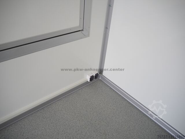 *entry door with personal lock lockable*, *step on drawbar*, *sales hatch on the right* with lifting aids lockable from the inside, electrical distribution, stable *crank supports*, *sandwich body* 25mm outside in white, manoeuvring handles, jockey wheel with holder, stable *welded frame* and a very stable V-drawbar hot-dip galvanized.