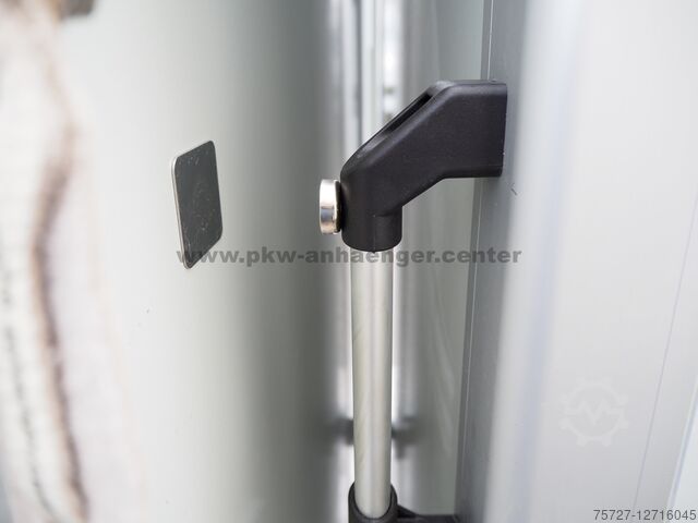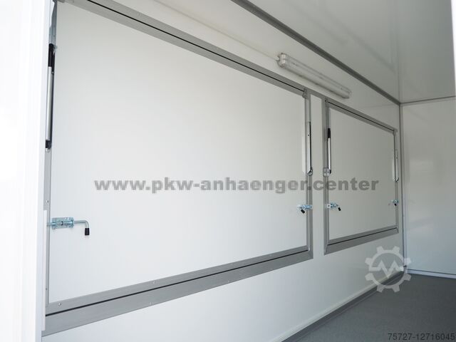 *entry door with personal lock lockable*, *step on drawbar*, *sales hatch on the right* with lifting aids lockable from the inside, electrical distribution, stable *crank supports*, *sandwich body* 25mm outside in white, manoeuvring handles, jockey wheel with holder, stable *welded frame* and a very stable V-drawbar hot-dip galvanized.
