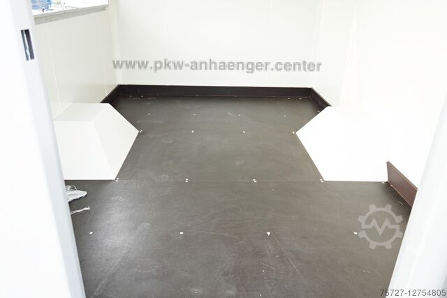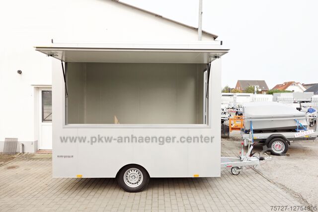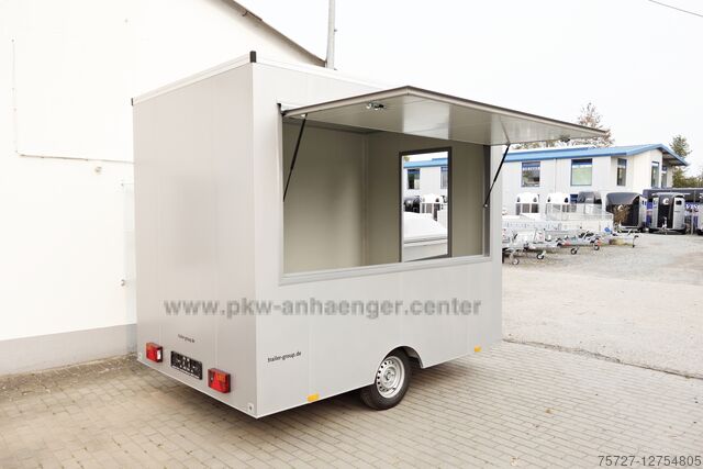 Our* snack bar trailers* from the *SELLER* range are manufactured with an insulated sandwich body. The extremely stable steel frame is welded and hot-dip galvanized, which ensures high stability. The *sales flap* and *entry door* have a welded frame so that the *sales case* remains permanently stable. A lockable personal lock in steel and *not in plastic* is built into the door. The *case body* made of 30 mm sheet steel sandwich has a galvanized outer skin which is also powder-coated. The insulation is made of a foamed PUR core. The *car trailer* is silver-grey on the outside and white on the inside. Four crank supports jack up the *snack van*.