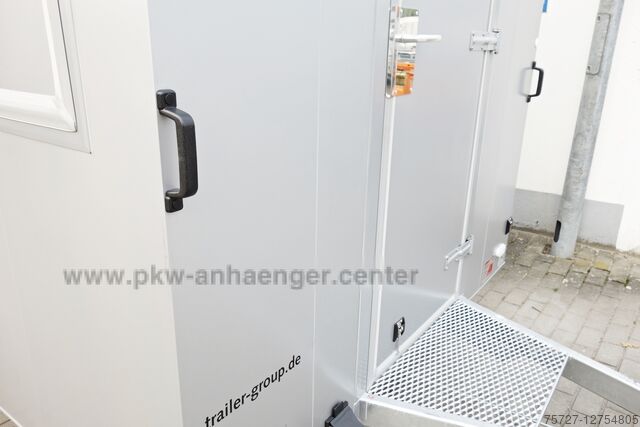 *entry door lockable with personal lock*, *step on drawbar*, *sales flap on the right* with lifting aids lockable from the inside, stable *crank supports*, *sandwich body* 30mm outside in silver inside white, manoeuvring handles, jockey wheel with holder, stable *welded frame* and a very stable V-drawbar hot-dip galvanized.