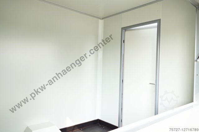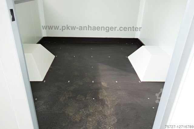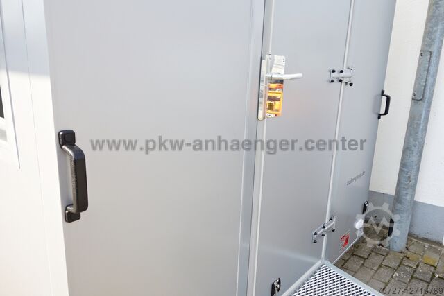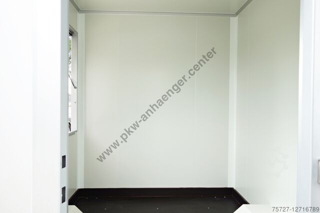 *entry door with personal lock lockable*, *step on drawbar*, *sales flap on the right* with lifting aids lockable from the inside, stable *crank supports*, *sandwich body* 30mm outside in silver inside white, manoeuvring handles, jockey wheel with holder, stable *welded frame* and a very stable V-drawbar hot-dip galvanized.