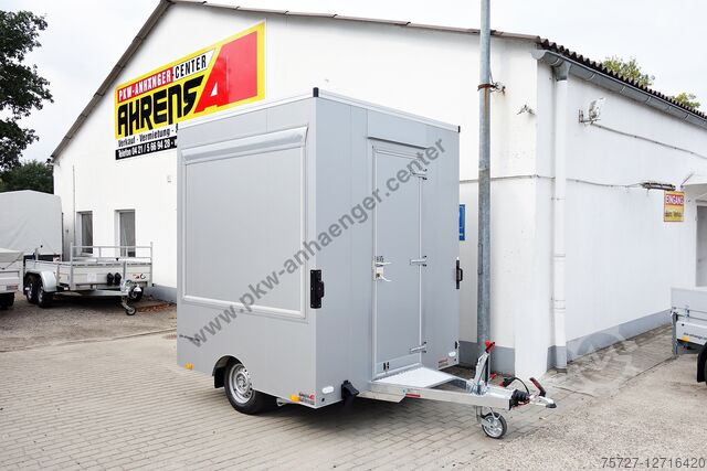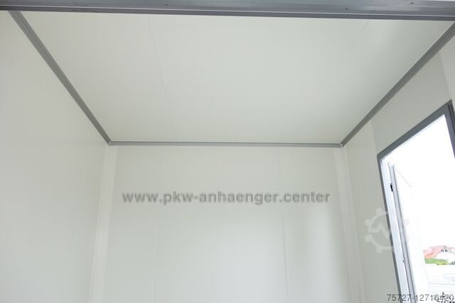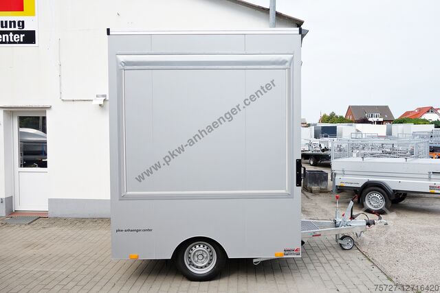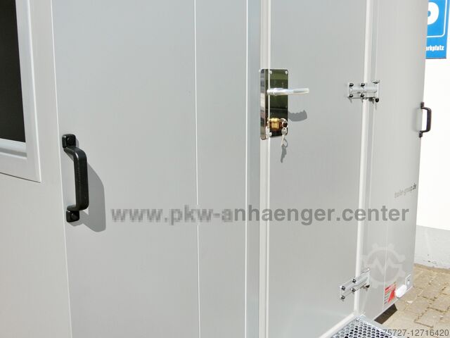 The flaps and doors have a welded frame so that the sales box is permanently stable. A proper personal lock in steel and *not in plastic* is installed in the door. The 30 mm sandwich case body has a galvanized sheet steel outer skin which is also powder-coated. The insulation is a PUR foam core. The *car trailer* is silver-grey on the outside and white on the inside. The *snack van* is supported by 4 crank supports.