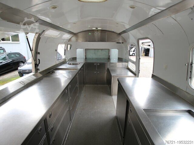 Thermo King refrigeration unit, refrigeration unit with second evaporator, insulated, new general inspection (HU/AU), vehicle length 9,600 mm, vehicle width 2,500 mm, vehicle height 2,750 mm. Airstream Land Yacht Sovereign, catering and food trailer. Kitchen installation with serving hatch, work area, sink, cupboards, shelves, hot water and wastewater systems. Combination steamer, 220/400 volt connection, industrial dishwasher, refrigerator, walk-in cooling/freezing cell with Thermo King unit for deep-freeze function down to minus 20°C. Power sockets throughout the interior, various windows, entrance door with fly screen, marker lights, roof hatches, fresh water tank, wastewater tank, flow heater, 2x 140Ah 12V AGM batteries.