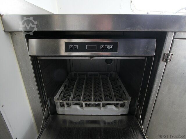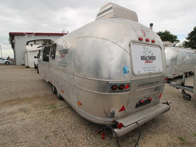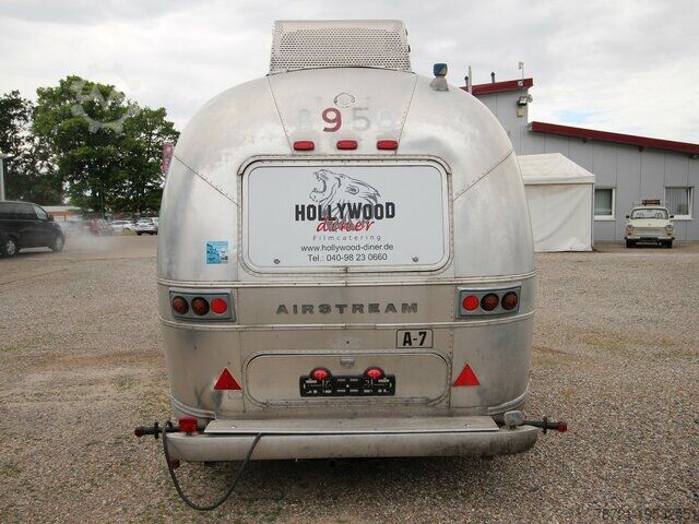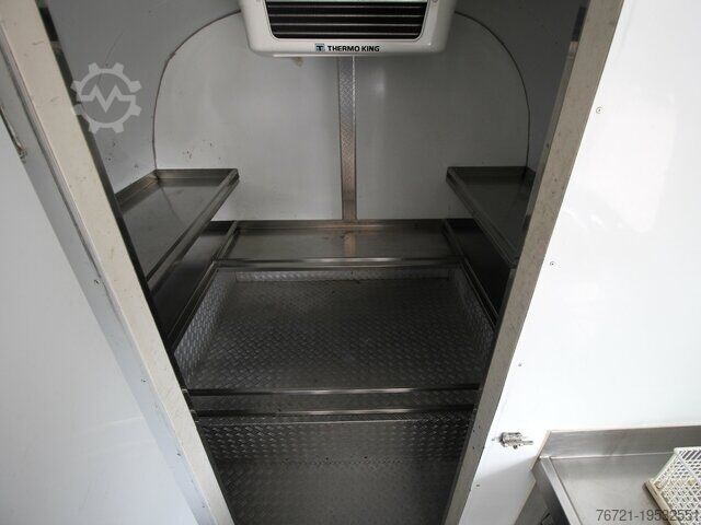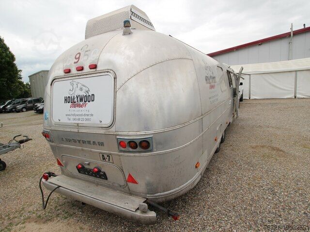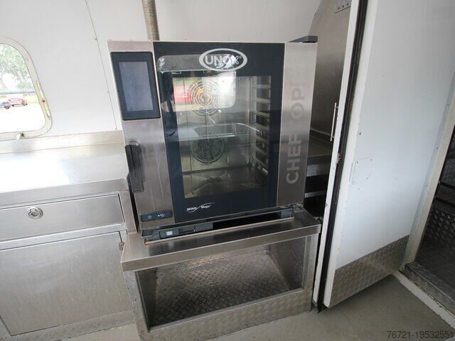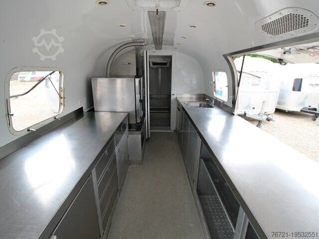 Thermo King refrigeration unit, refrigeration unit with second evaporator, insulated, new General Inspection (HU/AU), vehicle length 9800 mm, vehicle width 2420 mm, vehicle height 2800 mm. Airstream Land Yacht Sovereign catering and food trailer. Professional kitchen fit-out including serving hatch, work area, sink, cabinets, shelves, hot water, wastewater, combi steamer, 220/400 Volt connection, industrial dishwasher, refrigerator, walk-in cold room/freezer, walk-in cold room/freezer by Thermo King up to minus 20 degrees with deep freeze function. Multiple sockets throughout the interior, various windows, entrance door with fly screen, marker lights, roof hatches, fresh water tank, wastewater tank, instantaneous water heater, two 140Ah 12V batteries (AfM).