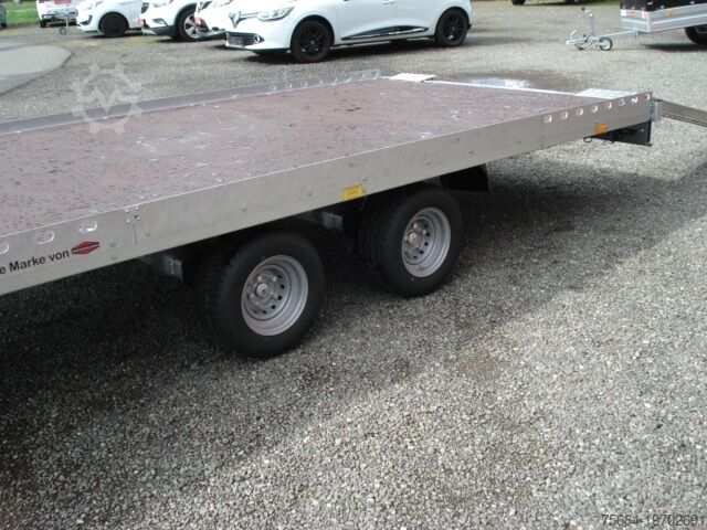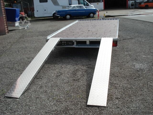 Phenolic plywood floor, 13-pin connector, automatic jockey wheel, 8 lashing points on the loading surface, braked, rail box with flap and aluminum loading ramps, 10-inch wheels, low loading height of 600mm, shock absorbers, 100 km/h approval, V-drawbar