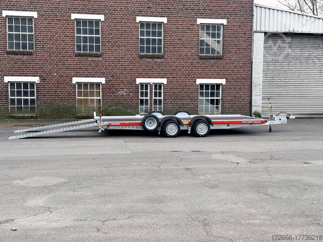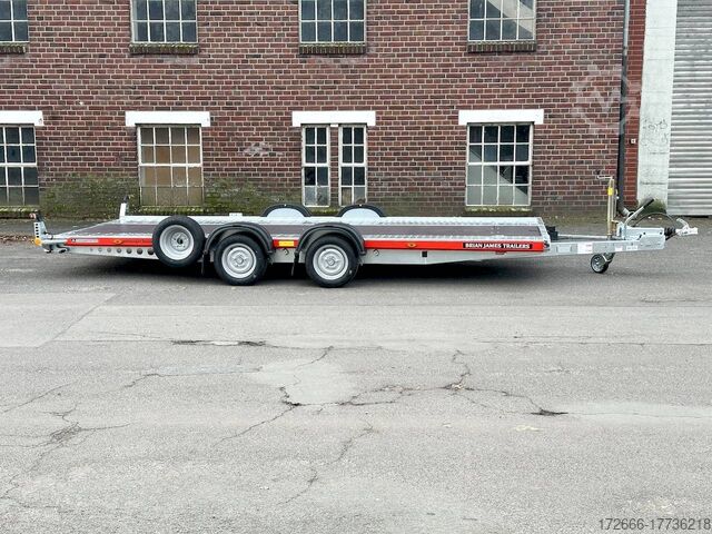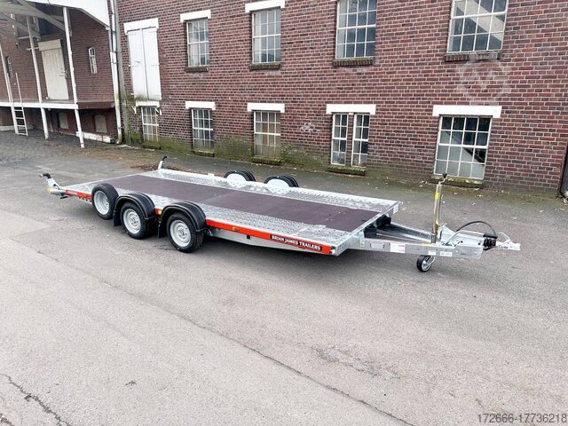 Automatic reverse drive, very flat chassis / drive-on ramps / rear supports / perforated lashing floor / e-wheel, hot-dip galvanizing, * IMMEDIATELY AVAILABLE * incl. very flat chassis / drive-on ramps / rear supports / perforated lashing floor / e-wheel Technical data: - Make: Brian James - Model: A4 Transporter - Vehicle type: Car transporter - Vehicle condition: New vehicle - First registration: without first registration - TÜV/HU: 2 years from first registration - Internal dimensions (L x W x H): 450 x 200 x 0 cm - External dimensions (L x W x H): 604 x 238 x 100 cm - Loading height of floor: 42 cm - Perm. Gross weight: 2,600 kg - Unladen weight: 670 kg - Payload: 1.930 kg - Chassis: Low loader (wheels next to the body) - Tyres: 195/60R12C - Chassis: ALKO rubber spring axle - Support wheel: Yes, automatic - 100 km/h approval: Optional, can be retrofitted DESCRIPTION - Low-frame construction enables an extra low loading height of 420 mm - Very stable welded steel frame - Closed loading area made of durable and resilient phenolic resin laminated wood with anti-slip surface. - Lockable front floor storage box with spring-loaded lid - Hole pattern of hot-dip galvanized steel lanes - Numerous lashing points and a heavy-duty floor offer flexible lashing options and perfect grip. - Side panels color: red - Frame completely hot-dip galvanized - Easily extendable, roller-mounted (Easy-Gilde) drive-on ramps (2400 mm) ensure an extremely flat drive-on angle - Fold-out, spring-supported support legs complement the extendable ramps. Can be folded in and out in seconds with the foot - Rear supports with dual function: when folded out, they support the load and when folded in, they lock the ramps securely in position during transportation. - Spare wheel mounted on the side at the rear - Automatic reverse drive - ALKO overrun device and parking brake - Cast steel coupling head with integrated ALKO high-security lock - Very stable V-drawbar REINFORCED - 13-pin plug - Reversing lights - Large safety lights - Robust rear light protection - Integrated rear fog light - Automatic center support wheel - 5-year chassis warranty New vehicle with warranty and TÜV. We are happy to offer you suitable financing !, Descriptions and pictures are protected by copyright !!! Over 800 trailers immediately available for you! We are for over 30 years Brian James / Humbaur / Hapert / Unsinn / Cheval Liberte / Koch / Debon / Stedele / TPV / Tohaco / Vezeko / Variant / Vlemmix - specialized dealer & repair - workshop - delivery Germany-wide with surcharge possible! Anhänger Zentrum BAUMANN GmbH Dinxperloer Str. 389 46399 Bocholt - Errors, omissions and prior sale excepted -