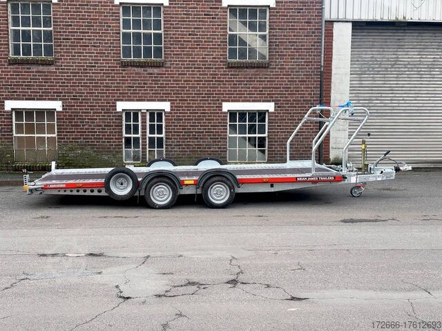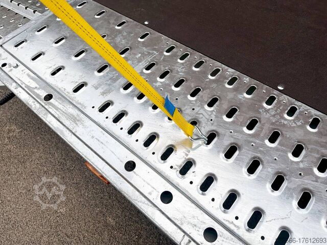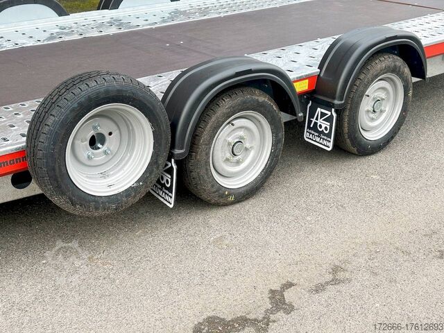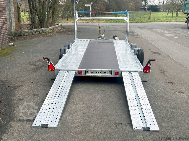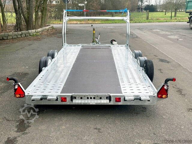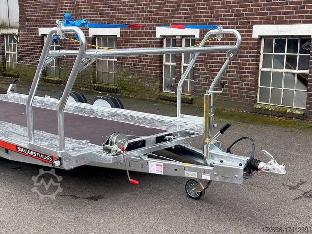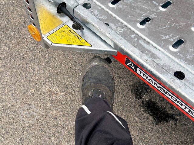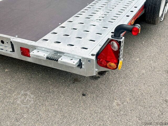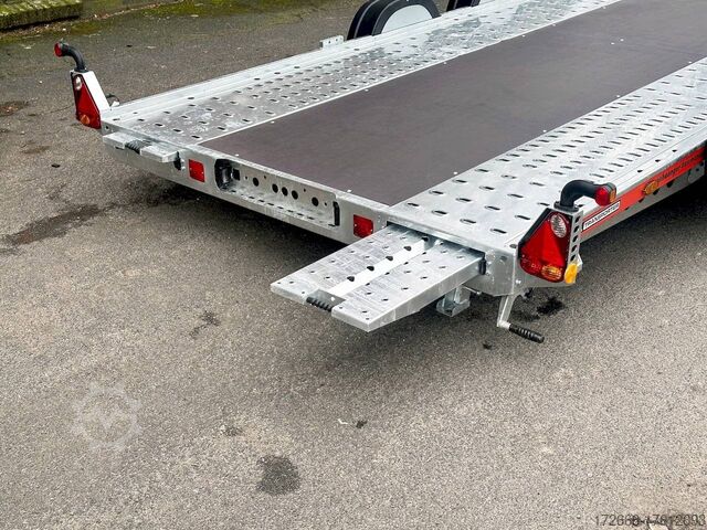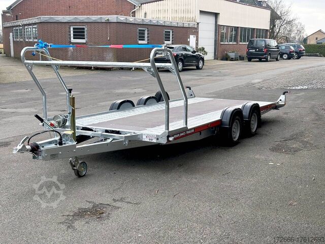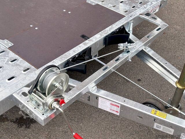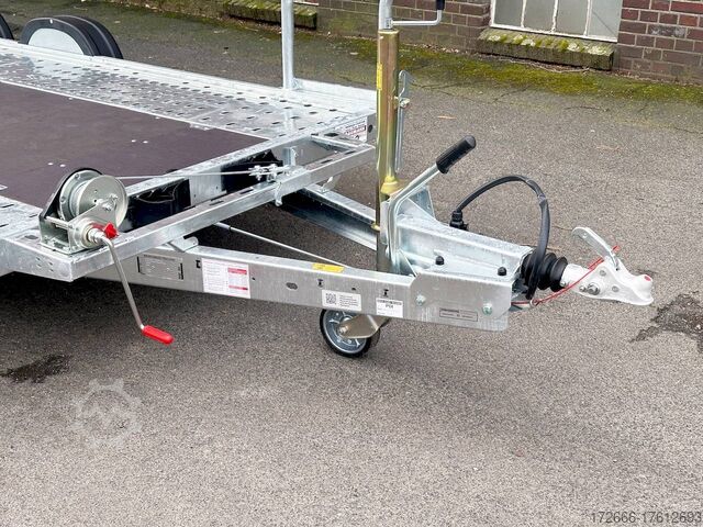 Automatic reverse drive, manual cable winch / tire rack / very flat chassis / drive-on ramps / rear supports / perforated lashing floor / e-wheel, hot-dip galvanized, * IMMEDIATELY AVAILABLE * incl. Manual cable winch / tire rack / very flat chassis / drive-on ramps / rear supports / perforated lashing floor / e-wheel Technical data: - Make: Brian James - Model: A4 Transporter - Vehicle type: Car transporter - Vehicle condition: New vehicle - Initial registration: Without initial registration - TÜV/HU: 2 years from initial registration - Interior dimensions (L x W x H): 500 x 200 x 0 cm - Exterior dimensions (L x W x H): 654 x 238 x 100 cm - Loading height of floor: 42 cm - Perm. Gross weight: 3,000 kg - Unladen weight: 757 kg - Payload: 2.243 kg - Chassis: Low loader (wheels next to the body) - Tyres: 195/60R12C - Chassis: ALKO rubber spring axle - Support wheel: Yes, automatic - 100 km/h approval: Optional, can be retrofitted DESCRIPTION - Low frame construction enables an extra low loading height of 420 mm - Very stable welded steel frame - Closed loading area made of durable and resilient phenolic resin laminated wood with anti-slip surface. - Lockable front floor storage box with spring-loaded lid - Hole pattern of hot-dip galvanized steel lanes - Numerous lashing points and a heavy-duty floor offer flexible lashing options and perfect grip. - Side panels color: red - Frame completely hot-dip galvanized - Easily extendable, roller-mounted (Easy-Gilde) drive-on ramps (2400 mm) ensure an extremely flat drive-on angle - Fold-out, spring-supported support legs complement the extendable ramps. Can be folded in and out in seconds using the foot - Rear supports with dual function: when folded out, they support the load and when folded in, they lock the ramps securely in position during transportation. - Spare wheel mounted at the rear on the side - Automatic reverse drive - ALKO overrun device and parking brake - Cast steel coupling head with integrated ALKO high-security lock - Very stable V-drawbar REINFORCED - 13-pin plug - Reversing lights - Large safety lighting - Robust protection for the rear lights - Integrated rear fog light - Automatic support wheel in the middle - High tire rack + protection with steel cable lock - Specially designed for transporting spare wheels on the trailer without losing space on the loading area. - incl. safety cable that runs through all wheels - manual cable winch with automatic brake function, adjustable roller feed-through (6-stage) 5-year chassis warranty New vehicle with warranty and TÜV. We are happy to offer you suitable financing !, Descriptions and pictures are protected by copyright !!! Over 800 trailers immediately available for you! We are for over 30 years Brian James / Humbaur / Hapert / Unsinn / Cheval Liberte / Koch / Debon / Stedele / TPV / Tohaco / Vezeko / Variant / Vlemmix - specialized dealer & repair - workshop - delivery Germany-wide with surcharge possible! Anhänger Zentrum BAUMANN GmbH Dinxperloer Str. 389 46399 Bocholt - Errors, omissions and prior sale reserved -