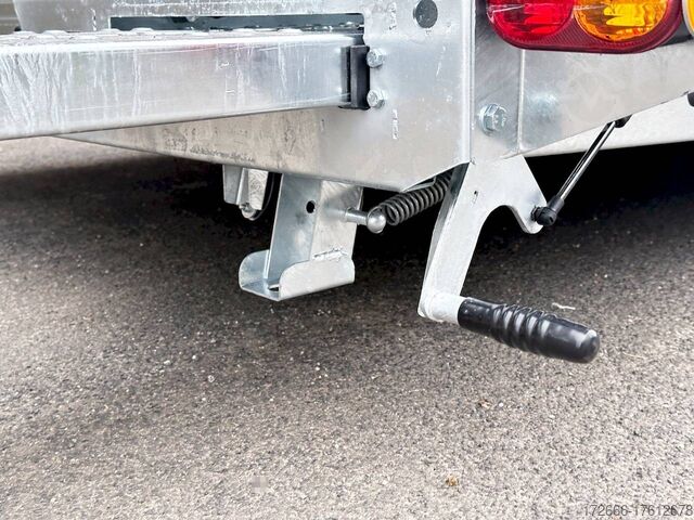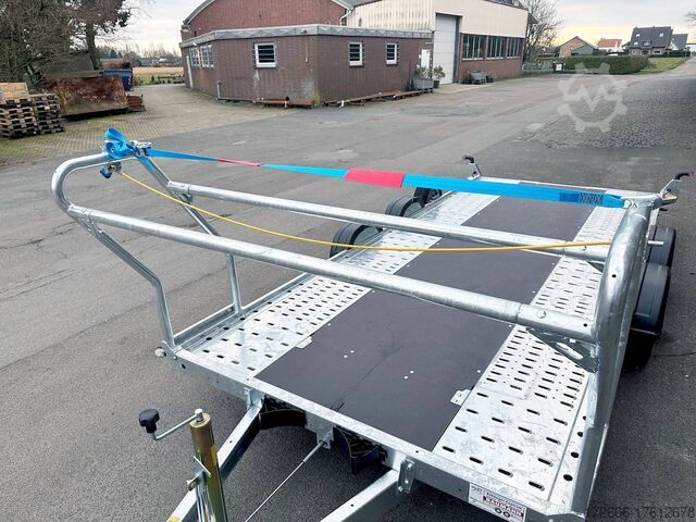 Automatic reverse drive, manual cable winch / tire rack / very flat chassis / drive-on ramps / rear supports / perforated lashing floor / e-wheel, hot-dip galvanizing, * IMMEDIATELY AVAILABLE * incl. Manual cable winch / tire rack / very flat chassis / drive-on ramps / rear supports / perforated lashing floor / e-wheel Technical data: - Make: Brian James - Model: A4 Transporter - Vehicle type: Car transporter - Vehicle condition: New vehicle - Initial registration: Without initial registration - TÜV/HU: 2 years from initial registration - Interior dimensions (L x W x H): 500 x 200 x 0 cm - Exterior dimensions (L x W x H): 654 x 238 x 100 cm - Loading height of floor: 42 cm - Perm. Total weight: 3,000 kg - Unladen weight: 731 kg - Payload: 2.269 kg - Chassis: Low loader (wheels next to the body) - Tyres: 195/60R12C - Chassis: ALKO rubber spring axle - Support wheel: Yes, automatic - 100 km/h approval: Optional, can be retrofitted DESCRIPTION - Low frame construction enables an extra low loading height of 420 mm - Very stable welded steel frame - Closed loading area made of durable and resilient phenolic resin laminated wood with anti-slip surface. - Lockable front floor storage box with spring-loaded lid - Hole pattern of hot-dip galvanized steel lanes - Numerous lashing points and a heavy-duty floor offer flexible lashing options and perfect grip. - Side panels color: red - Frame completely hot-dip galvanized - Easily extendable, roller-mounted (Easy-Gilde) drive-on ramps (2400 mm) ensure an extremely flat drive-on angle - Fold-out, spring-supported support legs complement the extendable ramps. Can be folded in and out in seconds using the foot - Rear supports with dual function: when folded out, they support the load and when folded in, they lock the ramps securely in position during transportation. - Spare wheel mounted on the side at the rear - Automatic reverse drive - ALKO overrun device and parking brake - Cast steel coupling head with integrated ALKO high-security lock - Very stable V-drawbar REINFORCED - 13-pin plug - Reversing lights - Large safety lights - Robust protection for the rear lights - Integrated rear fog light - Automatic support wheel in the middle - High tire rack + protection with steel cable lock - Specially designed for transporting spare wheels on the trailer without losing space on the loading area. - incl. safety cable that runs through all wheels - manual cable winch with automatic brake function, adjustable roller feed-through (6-stage) 5-year chassis warranty New vehicle with warranty and TÜV. We are happy to offer you suitable financing !, Descriptions and pictures are protected by copyright !!! Over 800 trailers immediately available for you! We are for over 30 years Brian James / Humbaur / Hapert / Unsinn / Cheval Liberte / Koch / Debon / Stedele / TPV / Tohaco / Vezeko / Variant / Vlemmix - specialized dealer & repair - workshop - delivery Germany-wide with surcharge possible! Anhänger Zentrum BAUMANN GmbH Dinxperloer Str. 389 46399 Bocholt - Errors, omissions and prior sale excepted -