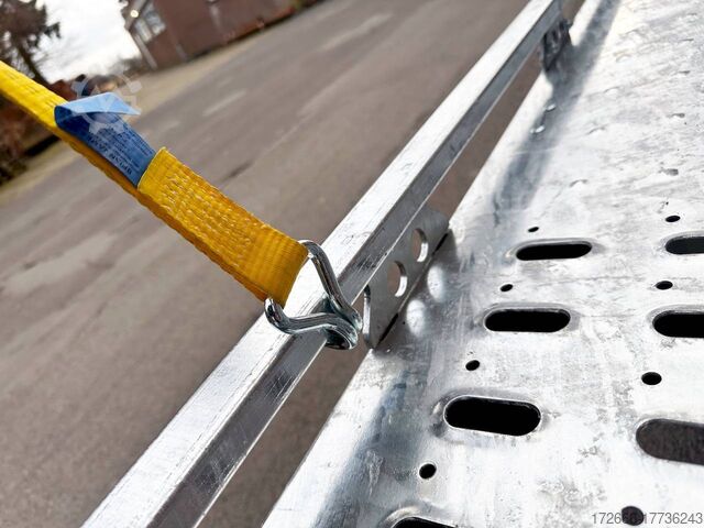 Automatic reverse drive, sloping rear / drive-on ramps 2, hot-dip galvanized, 35m / perforated lashing floor / e-wheel / floor storage box, * IMMEDIATELY AVAILABLE * incl. incl. sloping rear / drive-on ramps 2.35m / perforated lashing floor / e-wheel / floor storage box Technical data: - Make: Brian James - Model: T Transporter 231 - Vehicle type: Car transporter - Vehicle condition: New vehicle - First registration: without first registration - TÜV/HU: 2 years from first registration - Interior dimensions (L x W x H): 450 x 210 x 0 cm - Exterior dimensions (L x W x H): 610 x 218 x 100 cm - Loading height of floor: 65 cm - Perm. Total weight: 3,500 kg - Unladen weight: 954 kg - Payload: 2,546 kg - Chassis: High loader (wheels under the body) - Tyres: 195/60R12C - Chassis: ALKO rubber suspension axle - Support wheel: Yes - 100 km/h approval: Optional, can be retrofitted DESCRIPTION - Perforated steel lashing floor offers high slip resistance and is extremely wear-resistant, even under the toughest operating conditions. - Additionally sloped rear ensures a particularly low drive-on angle - Vehicle can also be fitted with all options after purchase: enormous potential for retrofitting: hydraulic tipping functions, winches, other ramps, etc. Can be retrofitted at any time - Very sturdy welded steel frame - Storage compartments embedded in the loading area for drive-on ramps at the rear - 2x perforated steel ramps, galvanized steel, 2.35 m long - Sliding contact edge for drive-on ramps for different track widths - Lockable floor storage box with spring-loaded lid - Perforated track pattern made of galvanized steel - Numerous lashing points and a heavy-duty floor offer flexible lashing options and perfect grip. - Side panels color: black - Additional lashing options thanks to side railing - Removable railing all round: The multi-part side profile railing offers numerous lashing points and is removable so that wider loads can be transported. - Frame completely hot-dip galvanized - Spare wheel mounted on the drawbar for easy access - Automatic reverse drive - ALKO overrun device and parking brake - Cast steel coupling head with integrated ALKO high-security lock - Very stable V-drawbar REINFORCED - 13-pin plug - Reversing lights - Large LED safety lighting - Complete LED lighting: Extremely bright, durable and reliable. - dynamic LED indicators are clearly visible even in bad weather - robust protection for the rear lights - integrated rear fog light - various front, side and rear marker lights - heavy-duty support wheel - 5-year chassis warranty New vehicle with warranty and TÜV. We are happy to offer you suitable financing !, Descriptions and pictures are protected by copyright !!! Over 800 trailers immediately available for you! We are for over 30 years Brian James / Humbaur / Hapert / Unsinn / Cheval Liberte / Koch / Debon / Stedele / TPV / Tohaco / Vezeko / Variant / Vlemmix - specialized dealer & repair - workshop - delivery Germany-wide with surcharge possible! Anhänger Zentrum BAUMANN GmbH Dinxperloer Str. 389 46399 Bocholt - Errors, omissions and prior sale excepted -