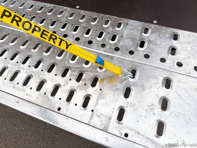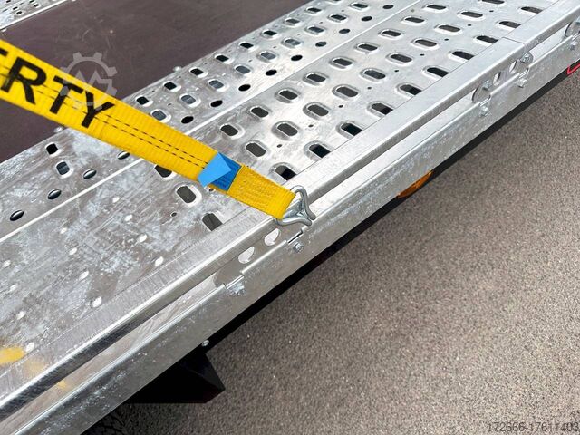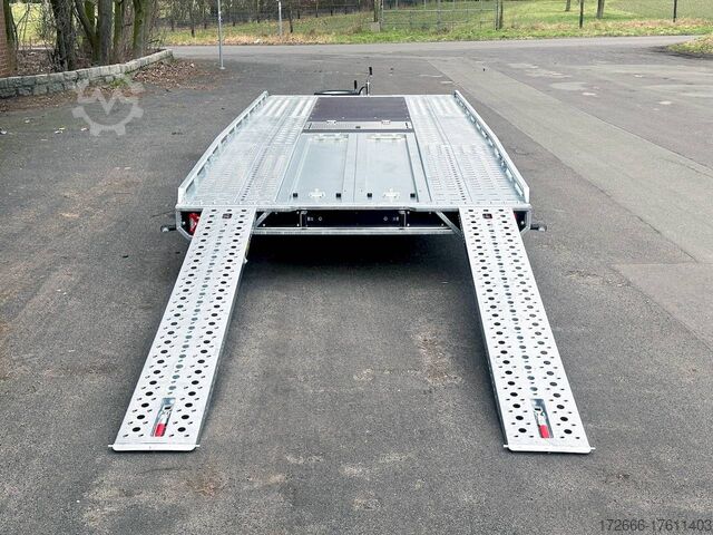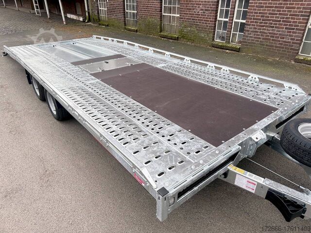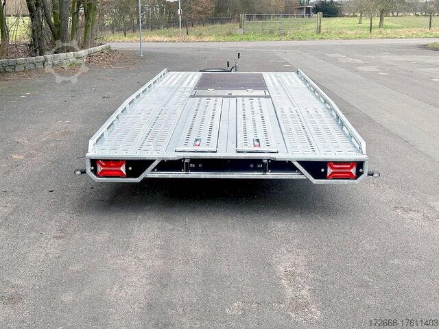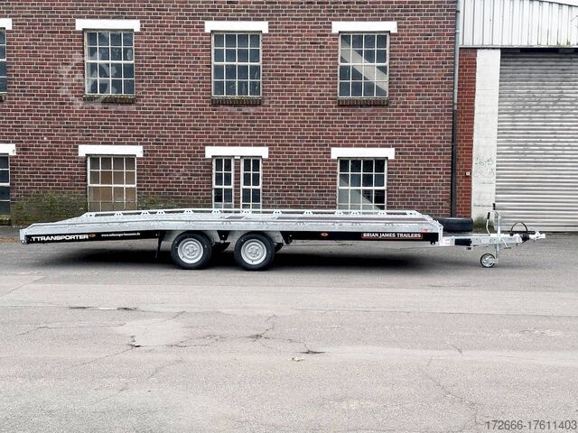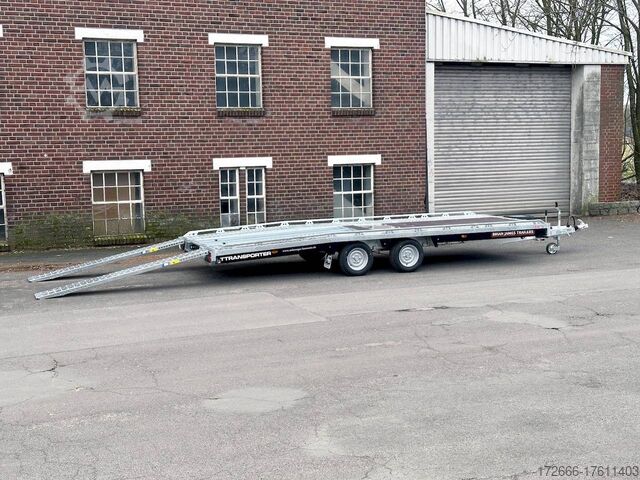 Automatic reverse drive, sloping rear / drive-on ramps 2, hot-dip galvanized, 35m / perforated lashing floor / e-wheel / floor storage box, * IMMEDIATELY AVAILABLE * incl. incl. sloping rear / drive-on ramps 2.35m / perforated lashing floor / e-wheel / floor storage box Technical data: - Make: Brian James - Model: T Transporter 231 - Vehicle type: Car transporter - Vehicle condition: New vehicle - First registration: without first registration - TÜV/HU: 2 years from first registration - Interior dimensions (LxWxH): 550 x 210 x 0 cm - Exterior dimensions (LxWxH): 710 x 218 x 100 cm - Loading height of floor: 65 cm - Perm. Total weight: 3,500 kg - Unladen weight: 936 kg - Payload: 2,564 kg - Chassis: High loader (wheels under the body) - Tyres: 195/60R12C - Chassis: ALKO rubber suspension axle - Support wheel: Yes - 100 km/h approval: Optional, can be retrofitted DESCRIPTION - Perforated steel lashing floor offers high slip resistance and is extremely wear-resistant, even under the toughest operating conditions. - Additionally sloped rear ensures a particularly low drive-on angle - Vehicle can also be fitted with all options after purchase: enormous potential for retrofitting: hydraulic tipping functions, winches, other ramps, etc. Can be retrofitted at any time - Very sturdy welded steel frame - Storage compartments embedded in the loading area for drive-on ramps at the rear - 2x perforated steel ramps, galvanized steel, 2.35 m long - Sliding contact edge for drive-on ramps for different track widths - Lockable floor storage box with spring-loaded lid - Perforated track pattern made of galvanized steel - Numerous lashing points and a heavy-duty floor offer flexible lashing options and perfect grip. - Side panels color: black - Additional lashing options thanks to side railing - Removable railing all round: The multi-part side profile railing offers numerous lashing points and is removable so that wider loads can be transported. - Frame completely hot-dip galvanized - Spare wheel mounted on the drawbar for easy access - Automatic reverse drive - ALKO overrun device and parking brake - Cast steel coupling head with integrated ALKO high-security lock - Very stable V-drawbar REINFORCED - 13-pin plug - Reversing lights - Large LED safety lighting - Complete LED lighting: Extremely bright, durable and reliable. - dynamic LED indicators are clearly visible even in bad weather - robust protection for the rear lights - integrated rear fog light - various front, side and rear marker lights - heavy-duty support wheel - 5-year chassis warranty New vehicle with warranty and TÜV. We are happy to offer you suitable financing !, Descriptions and pictures are protected by copyright !!! Over 800 trailers immediately available for you! We are for over 30 years Brian James / Humbaur / Hapert / Unsinn / Cheval Liberte / Koch / Debon / Stedele / TPV / Tohaco / Vezeko / Variant / Vlemmix - specialized dealer & repair - workshop - delivery Germany-wide with surcharge possible! Anhänger Zentrum BAUMANN GmbH Dinxperloer Str. 389 46399 Bocholt - Errors, omissions and prior sale excepted -