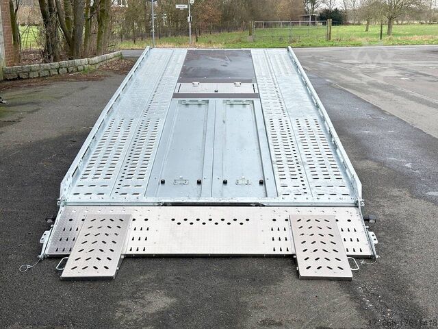 hydraulic pump / sloping rear / continuous ramp / perforated lashing floor / e-wheel / floor storage box, automatic reversing, drive-on ramp, hot-dip galvanizing, * IMMEDIATELY AVAILABLE * incl. hydraulic pump / sloping rear / continuous ramp / perforated lashing floor / e-wheel / floor storage box Technical data: - Make: Brian James - Model: T Transporter 231 - Vehicle type: car transporter - Vehicle condition: new vehicle - First registration: without first registration - TÜV/HU: 2 years from first registration - Internal dimensions (LxWxH): 550 x 210 x 0 cm - External dimensions (LxWxH): 710 x 218 x 100 cm - Loading height of floor: 65 cm - Perm. Total weight: 3,500 kg - Unladen weight: 946 kg - Payload: 2,554 kg - Chassis: High loader (wheels under the body) - Tyres: 195/60R12C - Chassis: ALKO rubber suspension axle - Support wheel: Yes - 100 km/h approval: Optional, can be retrofitted DESCRIPTION - Perforated steel lashing floor offers high slip resistance and is extremely wear-resistant, even under the toughest operating conditions. - Additionally sloped rear ensures a particularly low drive-on angle - Vehicle can also be fitted with all options after purchase: enormous potential for retrofitting: winches, other ramps etc. can be retrofitted at any time - Very sturdy welded steel frame - Storage compartments for drive-on ramps at the rear recessed in the loading area - Sliding contact edge for drive-on ramps for different track widths - Continuous drive-on ramp, + additional ramps, foldable, adjustable (heavy-duty) - Hydraulic tipping function (hand pump) incl. cylinder, for very flat drive-on ramps. Hydraulic tipping function (hand pump incl. cylinder, for very flat drive-on angle - Lockable floor storage box with spring-loaded lid - Hole pattern of galvanized steel lanes - Numerous lashing points and a heavy-duty floor offer flexible lashing options and perfect grip. - Side panels color: black - Additional lashing options thanks to side railing - Removable railing all round: The multi-part side profile railing offers numerous lashing points and is removable so that wider loads can be transported. - Frame completely hot-dip galvanized - Spare wheel mounted on the drawbar for easy access - Automatic reverse drive - ALKO overrun device and parking brake - Cast steel coupling head with integrated ALKO high-security lock - Very stable V-drawbar REINFORCED - 13-pin plug - Reversing lights - Large LED safety lighting - Complete LED lighting: Extremely bright, durable and reliable. - dynamic LED indicators are clearly visible even in bad weather - robust protection for the rear lights - integrated rear fog light - various front, side and rear marker lights - heavy-duty support wheel - 5-year chassis warranty New vehicle with warranty and TÜV. We are happy to offer you suitable financing !, Descriptions and pictures are protected by copyright !!! Over 800 trailers immediately available for you! We are for over 30 years Brian James / Humbaur / Hapert / Unsinn / Cheval Liberte / Koch / Debon / Stedele / TPV / Tohaco / Vezeko / Variant / Vlemmix - specialized dealer & repair - workshop - delivery Germany-wide with surcharge possible! Anhänger Zentrum BAUMANN GmbH Dinxperloer Str. 389 46399 Bocholt - Errors, omissions and prior sale excepted -
