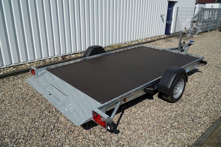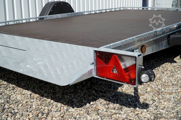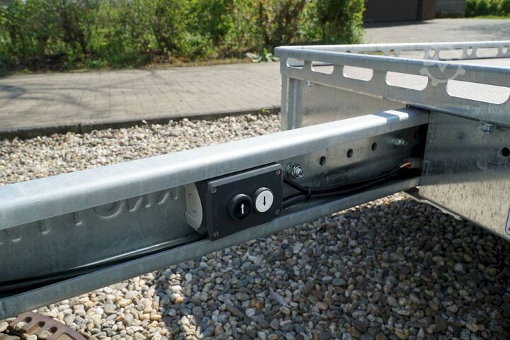Hydraulics, automatic reversing, hot-dip galvanizing, * IMMEDIATELY AVAILABLE * Technical data: - Type: New vehicle - Availability: IMMEDIATELY! - TÜV: 2 years from first registration - Floor: Multiplex floor with anti-slip surface - Gross vehicle weight: 1,800 kg - Unladen weight: 501 kg - Payload: 1,299 kg - Loading area dimensions: 350 x 180 x 10 cm (L x W) - Drive-on angle approx. 4 ?. - Tires: 195/50 RC 13C - Brake: yes - Support wheel: yes - Incl. vehicle documents (letter) - 100 km/h approval: Included! AA118/3518, top model, car transporter with one axle line, equipped with fully electronic air suspension system. For the regular user looking for the best possible quality. Mounting of the suspension system completely under the vehicle. Equipped with an 18 bar quality compressor with air dryer, electronic control and height control. 12V 70Ah vehicle battery. Particularly simple button operation. Only works with a fully connected 13-pin plug! Depending on choice with 18mm multiplex floor or 19mm aluminum floor profiles. Optionally with an additional remote control and/or with an additional air tank (5 liters). Standard equipment: - thermally galvanized chassis - very stable welded steel frame - rear sloping rear - very stable V-drawbar - plastic mudguards - wheel suspension, independent air suspension - incl. 100km/h approval - loading area can be lowered to the road surface or the ground by means of air suspension, drive-on angle approx. 4 ?. - Electronic air suspension - 2 air bellows - 2 adjustable shock absorbers - emergency valves, for external filling of the air suspension - 195/50 RC 13C tires - polyamide air hoses - stainless steel couplings - custom-made wiring harness - function only with fully occupied 13-pin socket - mounting suspension system completely under the loading area - 2 sensors for height control - electronic control in the drawbar - compressor 12V 18-bar - Made in Germany - integrated 12V, vehicle battery, 70Ah - plug for external battery charger - ASCU control system - 15mm multiplex floor panel, made of birch wood, with anti-slip coating and full-surface - lashing points, left, right and front - folding license plate holder with LED lighting, - support wheel, automatic - large-dimensioned safety lighting - integrated rear fog light - reversing light - 13-pin plug - registration papers: COC papers Accessories / optional extras available: - all-aluminum floor - tarpaulin AA3518, 330x180x180/193cm (LxWxH) desired color 4x zigzag lock from - box body AA3518, 25mm isol. panels met alum. Roll-up door - Fixed front wall / high front grille - 2. Compressor with additional air tank - Wireless remote control for air suspension system - External battery charger - Battery charger integrated in the vehicle with 230V connection - Spare wheel 13 inch - Aluminum alloy rims - Spring rod Autostop / wheel stopper to prevent driving too far - Mobile emergency compressor - Storage box for accessories - Winch hand 820 kg braked - Winch hand 1200 kg braked - Winch hand 1450 kg braked - Weather protection cover for winch New vehicle with warranty and TÜV. We are happy to offer you suitable financing !, Descriptions and pictures are protected by copyright !!! Over 800 trailers immediately available for you! We are Brian James / Humbaur / Hapert / Unsinn / Cheval Liberte / Koch / Debon / Stedele / TPV / Tohaco / Vezeko / Variant / Vlemmix - specialist for over 30 years.