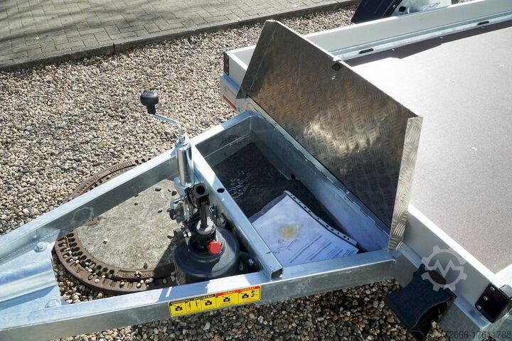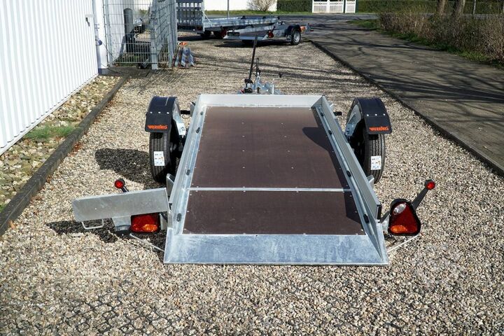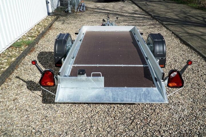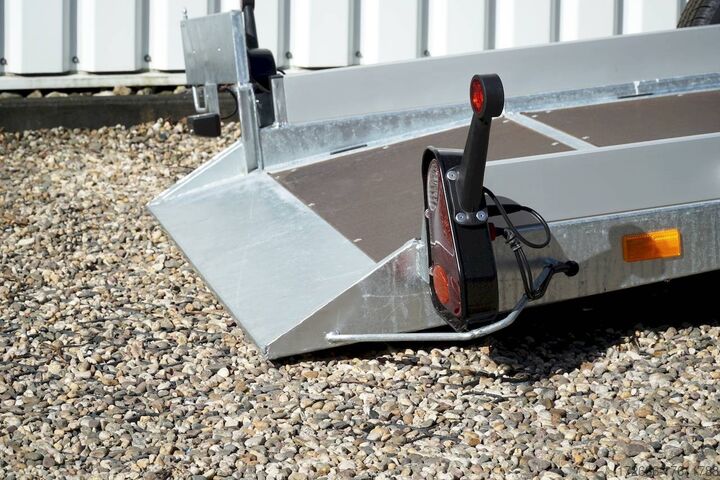 lowerable loading platform / manual hydraulics / unbraked, automatic reverse, hot-dip galvanized, unbraked, * IMMEDIATELY AVAILABLE * incl. lowerable loading platform / manual hydraulics / unbraked Technical data: - Type: New vehicle - TÜV: New/2 years - Availability: IMMEDIATELY! - Gross vehicle weight: 750kg - Unladen weight: 300 kg - Payload: 450 kg - Interior dimensions: 246 x 127 x 10 cm (L x W x H) - Overall exterior dimensions: 408 x 192 x 70cm (L x W x H) - Loading sill height: 47 cm - Tires: 165/70R13 steel rim - Brake: no - Support wheel: yes, 45mm with clamp - 100km/h: at extra charge - incl. Vehicle documents Vehicle superstructure: - Floor: Multiplex wooden floor - Drop sides: Aluminium anodized 3-sided - Drop side height: 10cm - Chassis: Low loader lowerable, ALKO rubber spring axle - Tipping function: lowerable - Hydraulics: Hand pump - Drive-on angle: approx. 6 - Wheel stopper: without - Overrun device & brake: ALKO - Frame/chassis: Welded hot-dip galvanized steel frame - Lashing eyes: 8 pieces laterally recessed - Winch: at extra charge - Supports: Supported by rear. - Ramps: with rear drive-over point - Lighting plug: 13-pin - Approval: COC papers Standard equipment: - Multiplex wooden floor - Extremely robust - Fixed 10 mm drop sides - Insertion options at all corners, e.g. for tarpaulin frame - Very sturdy welded steel frame - Frame completely hot-dip galvanized frame completely hot-dip galvanized - many stable cross beams therefore high point load - loading area can be lowered hydraulically - mechanical safety locking of the swivel axle in driving mode - with drive-over point at the rear - additional longitudinal struts welded in throughout - storage box at the front - 8 lashing eyes inside the loading area - license plate holder at the rear, can be swivelled away for loading - ALKO overrun device and parking brake - ALKO coupling head - very stable V-drawbar REINFORCED - 13-pin plug - reversing lights - large reversing lights - large reversing lights - large reversing lights - large reversing lights - large reversing lights. plug - reversing light - large safety lighting - integrated rear fog light - lighting recessed in rear frame - jockey wheel with central clamp - registration papers: COC papers Accessories can be retrofitted - please enquire: - anti-theft device - spare wheel - high tarpaulin - additional lashing eyes - reversing light - lashing straps - and much more. New vehicle with warranty and TÜV. We are happy to offer you suitable financing !, Descriptions and pictures are protected by copyright !!! Over 800 trailers immediately available for you! We are for over 30 years Brian James / Humbaur / Hapert / Unsinn / Cheval Liberte / Koch / Debon / Stedele / TPV / Tohaco / Vezeko / Variant / Vlemmix - specialized dealer & repair - workshop - delivery Germany-wide with surcharge possible! Anhänger Zentrum BAUMANN GmbH Dinxperloer Str. 389 46399 Bocholt - Errors, omissions and prior sale excepted -
