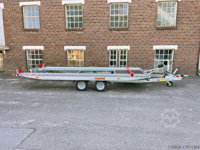 Hydraulics, automatic reverse drive, drive-on ramp, perforated plate floor / tiltable loading area / wheel stop bracket / spare wheel, hot-dip galvanizing, * IMMEDIATELY AVAILABLE * incl. perforated plate floor / tiltable loading area / wheel stop bracket / spare wheel Technical data: - Type: New vehicle - TÜV: New/2 years - Availability: IMMEDIATELY! - Gross vehicle weight: 2,700kg - Unladen weight: 790 kg - Payload: 1,910 kg - Interior dimensions: 502 x 209 x 0 cm (L x W x H) - Overall exterior dimensions: 670 x 215 x 100 cm (LxWxH) - Loading sill height: 60cm - Tires: 195/55R10 steel rim - Brake: yes - Support wheel: yes, automatic - 100km/h: at an extra charge - incl. Vehicle documents Vehicle superstructure: - Floor: 2x stand rails made of galvanized perforated sheet metal - Drop sides: without - Drop side height: 0cm - Chassis: High loader, ALKO rubber spring axle - Tipping function: yes - Hydraulics: manual hydraulics - Drive-on angle: - Wheel stop: adjustable wheel bumper - Overrun device & brake: ALKO - Frame/chassis: welded hot-dip galvanized steel frame - Lashing eyes: Perforated plate floor for lashing straps - Winch: yes. manual, with adjustable winch bracket - Supports: Support at the rear - Ramps: not necessary, drive-on wedges mounted on the vehicle - Plug lighting: 13-pin - Approval: COC papers Standard equipment: - Floor - 2 x stand rails made of galvanized perforated sheet metal - The approach rails firmly connected to the cargo bed. Length 680 mm. - 1 movable wheel stop bracket - very stable welded steel frame - tiltable loading area by means of hand hydraulics + 2 lifting cylinders - frame completely hot-dip galvanized - many stable cross beams therefore high point load - additional longitudinal struts welded in throughout - 12 lashing eyes inside the loading area, rubber-coated (750kg/pc) - automatic reversing - ALKO overrun device and parking brake - ALKO coupling head - very stable V-drawbar REINFORCED - 13-pin plug - reversing lights - large rear lights - approval for CO.O.D. plug - reversing lights - large safety lighting - LED rear lights - integrated rear fog light - swivel lighting - automatic center support wheel - spare wheel mounted under the cargo bed - registration papers: COC papers Incl. Special equipment: - Cable winch with cable winch bracket - Cable winch can be removed and adjusted in length Accessories can be retrofitted - please enquire: - 100 km/h approval with shock absorbers - anti-theft device - tarpaulin body - fixed box body - drop sides - additional wheel stops - storage box - additional lashing eyes - reversing lights - lashing straps - and much more. New vehicle with warranty and TÜV. We are happy to offer you suitable financing !, Descriptions and pictures are protected by copyright !!! Over 800 trailers immediately available for you! We are for over 30 years Brian James / Humbaur / Hapert / Unsinn / Cheval Liberte / Koch / Debon / Stedele / TPV / Tohaco / Vezeko / Variant / Vlemmix - specialized dealer & repair - workshop - delivery Germany-wide with surcharge possible! Anhänger Zentrum BAUMANN GmbH Dinxperloer Str. 389 46399 Bocholt - Errors, omissions and prior sale excepted -