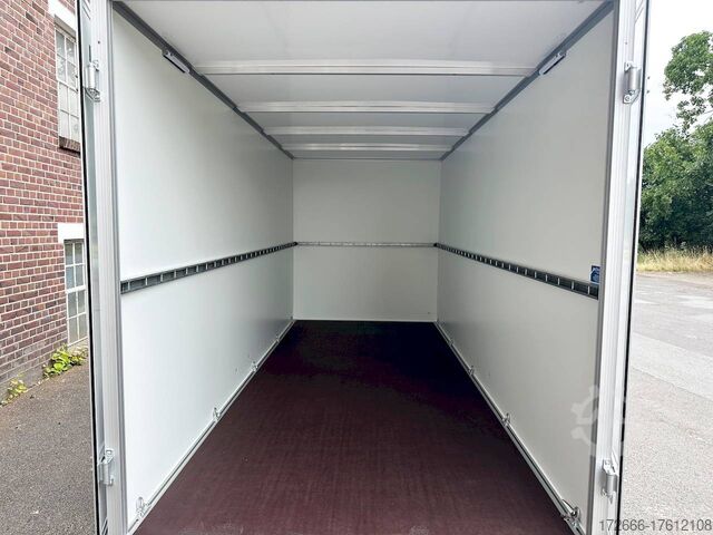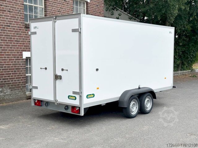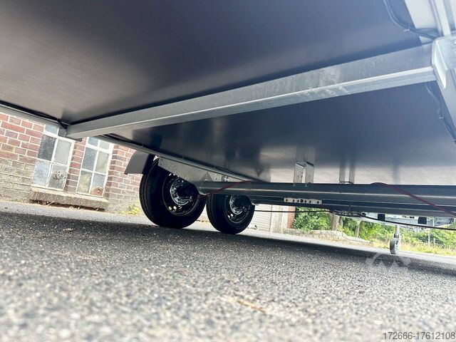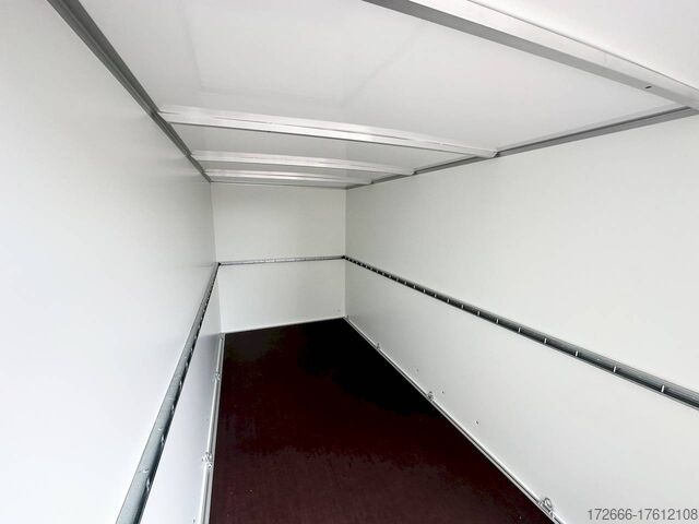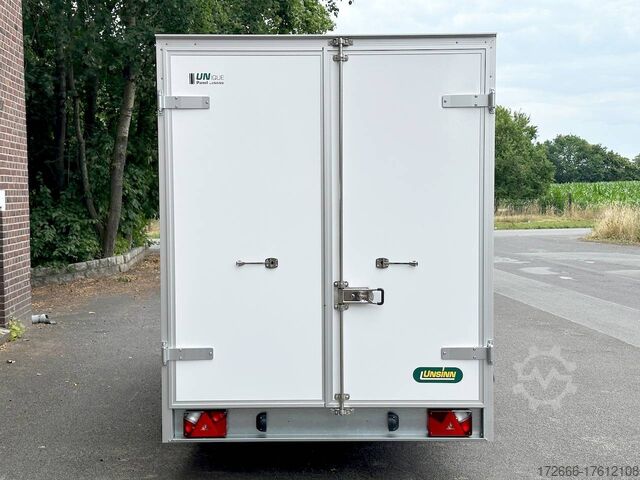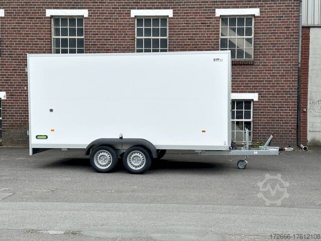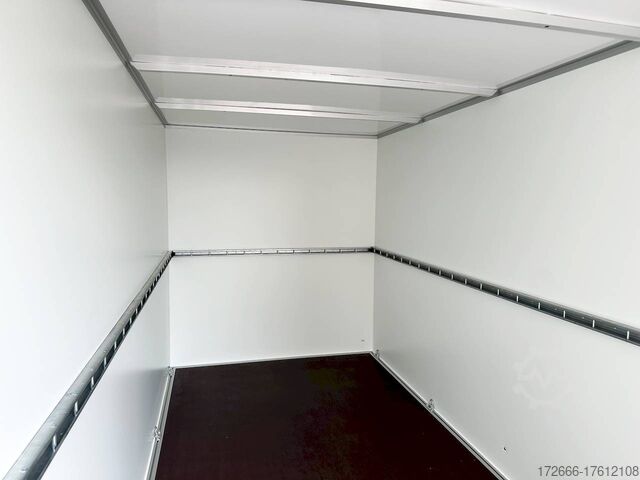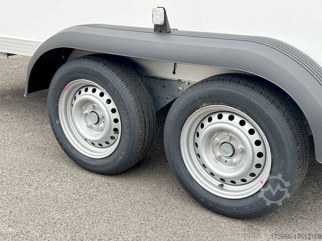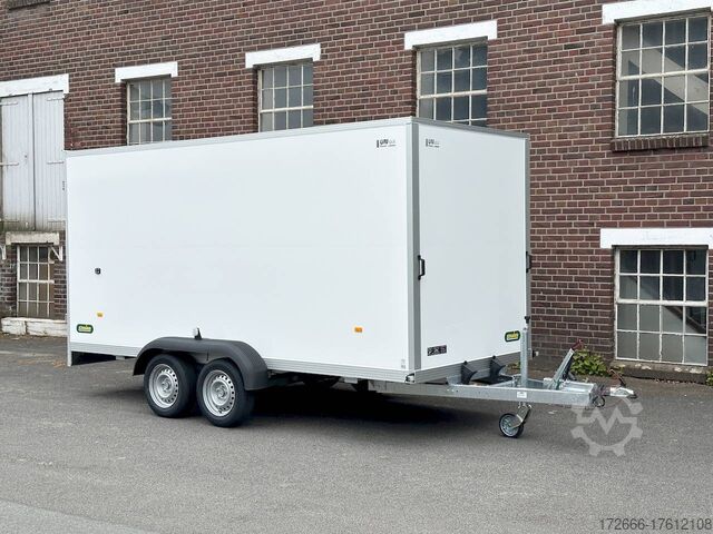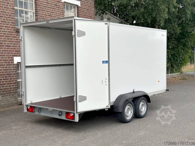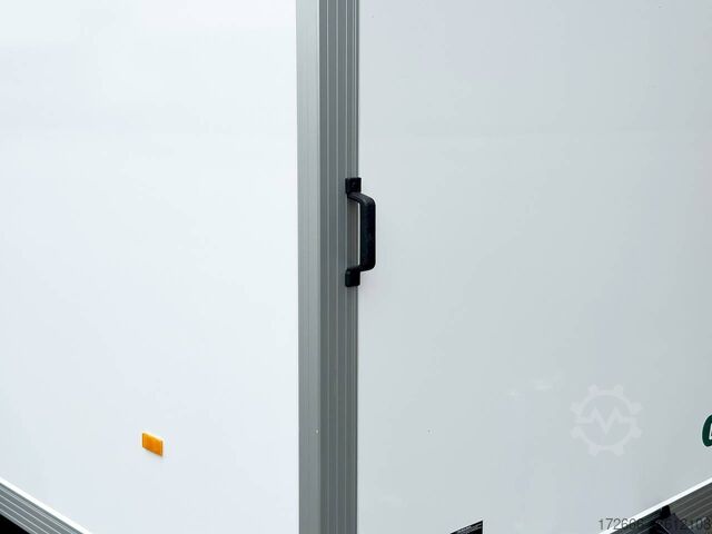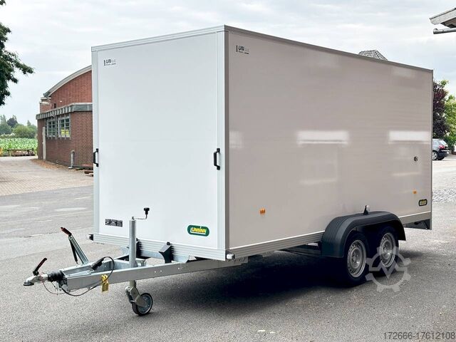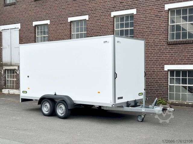 Hydraulics, Automatic reverse drive, Drive-on ramp, Hot-dip galvanizing, Unbraked, DOOR, GRP sandwich body walls, braked, * IMMEDIATELY AVAILABLE * with DOOR, GRP sandwich body walls, braked Technical data: - Type: New vehicle - TÜV: New/2 years - Availability: IMMEDIATELY! - Gross vehicle weight: 2,600 kg - Unladen weight: 640 kg - Payload: 1,960 kg - Interior dimensions: 426 x 175 x 194 cm (L x W x H) - Overall exterior dimensions: 569 x 227 x 252 cm (L x W x H) - Loading sill height: 55 cm - Tyres: 185/65R14 steel rim - Brake: yes - Support wheel: yes - 100 km/h: at extra charge - Incl. vehicle documents Vehicle body: - Floor: Wood, screen printing plate 18mm - Walls: GRP outside / sandwich and steel - Roof material: GRP sandwich roof - Chassis: ALKO rubber spring axle - Number of lashing eyes: optional retrofittable in lashing rail - Rear door: yes - Tailgate: no - Tailgate material: GRP steel sandwich - Tailgate/door function: espagnolette lock - Clearance dimension tailgate/flap: - - Interior light: optional - Supports: at an extra charge - Overrun device & brake: yes - 100km/h: incl. vehicle documents Surcharge - Overrun device & brake: yes, Alko - Frame/chassis: V-drawbar, hot-dip galvanized - Lighting plug: 13-pin - Approval: ZBII & COC papers Standard equipment: - Unique, torsion-resistant aluminum chassis for safe driving characteristics - Overrun device from ALKO - Walls made of lightweight panels, consisting of GRP steel sandwich in RAL 9016 - GRP outside for lettering and steel inside for impact resistance - Roof made of lightweight panels, consisting of GRP sandwich in RAL 9016 - Loading area made of multi-glued 18 mm screen printing plate, slip-resistant and waterproof - Rear frame and edging profiles made of special anodized aluminium profiles for attractive aesthetics - Rear doors - Stainless steel espagnolette lock and stainless steel door holder - Support wheel, automatic - Automatic reverse drive - Plastic mudguards - 13-pin plug - Reversing lights - Reversing lights Plug - reversing lights - large safety lighting - integrated rear fog light - registration papers: ZBII & COC papers Accessories can be retrofitted - please enquire: - anti-theft device - rear supports - 100km/H approval with wheel shock absorber - side door - motorcycle rockers, - motorcycle stand rails, - motorcycle lashing straps, - lashing straps - additional lashing eyes - slot-and-hole rails for tensioning straps & locking bars - bar strip with rubber coating for tensioning straps & locking bars - steel or aluminum locking bars - interior lights - reversing lights - and much more. New vehicle with warranty and TÜV. We are happy to offer you suitable financing !, Descriptions and pictures are protected by copyright !!! Over 800 trailers immediately available for you! We are for over 30 years Brian James / Humbaur / Hapert / Unsinn / Cheval Liberte / Koch / Debon / Stedele / TPV / Tohaco / Vezeko / Variant / Vlemmix - specialized dealer & repair - workshop - delivery Germany-wide with surcharge possible! Anhänger Zentrum BAUMANN GmbH Dinxperloer Str. 389 46399 Bocholt - Errors, omissions and prior sale excepted -