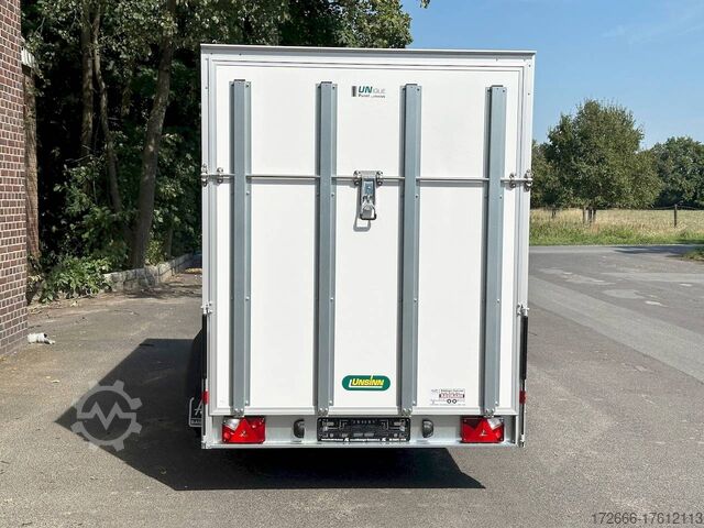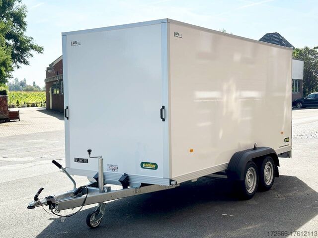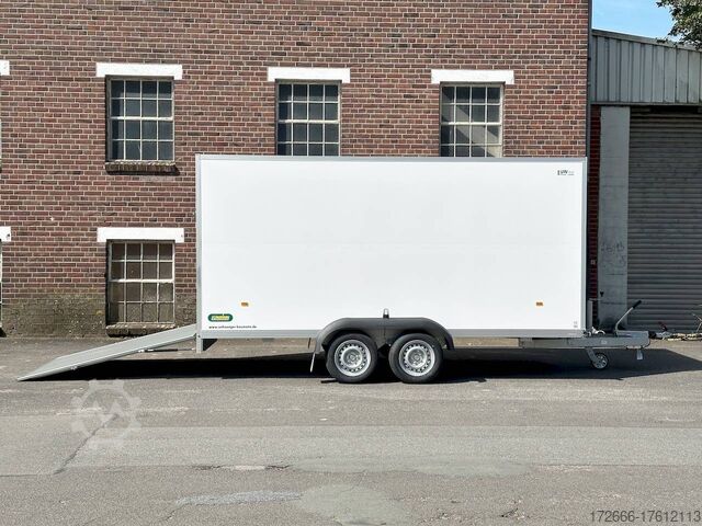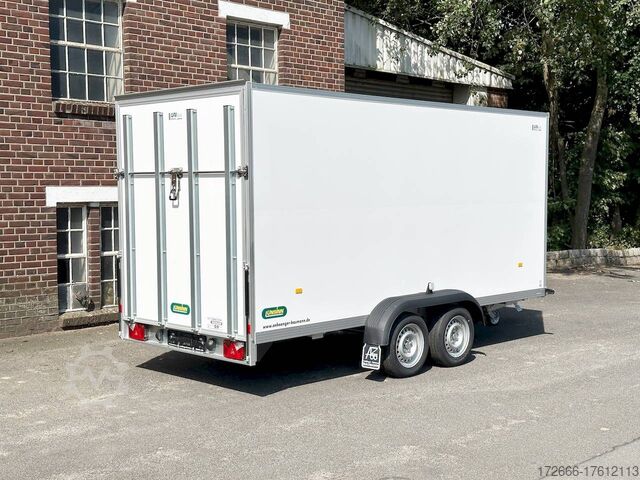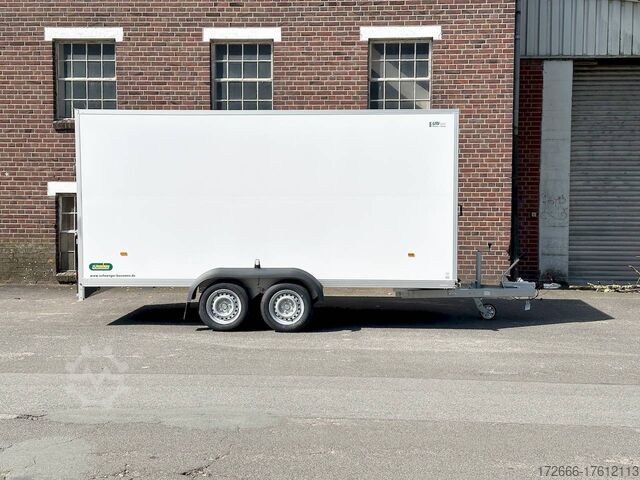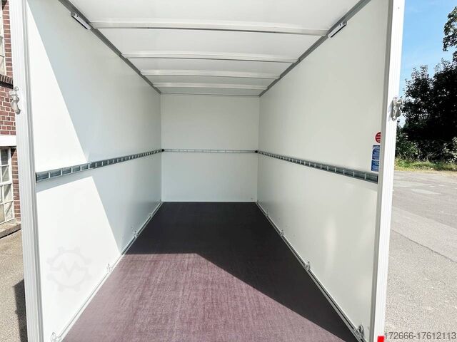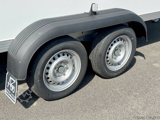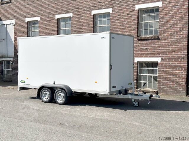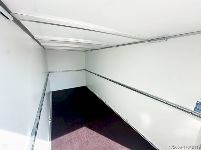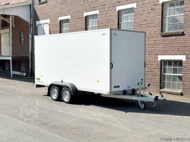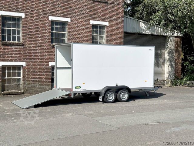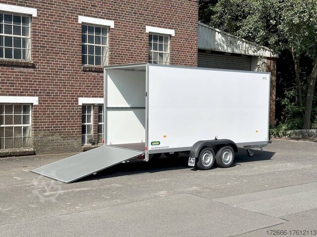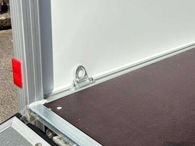 Hydraulics, automatic reverse drive, ramp, hot-dip galvanizing, unbraked, GRP sandwich body walls, braked, * IMMEDIATELY AVAILABLE * with ramp, GRP sandwich body walls, braked Technical data: - Type: New vehicle - TÜV: New/2 years - Availability: IMMEDIATELY! - Gross vehicle weight: 2,600 kg - Unladen weight: 665 kg - Payload: 1,935 kg - Interior dimensions: 426 x 175 x 194 cm (L x W x H) - Overall exterior dimensions: 569 x 227 x 252 cm (L x W x H) - Loading sill height: 55 cm - Tires: 185/65R14 steel rim - Brake: yes - Support wheel: yes - 100 km/h: at extra charge - incl. vehicle documents Vehicle body: - Floor: Wood, screen printing plate 18mm - Walls: GRP outside / sandwich and steel - Roof material: GRP sandwich roof - Chassis: ALKO rubber spring axle - Number of lashing eyes: optional retrofittable in lashing rail - Rear door: No - Tailgate: Yes - Tailgate material: GRP steel sandwich - Tailgate/door function: espagnolette lock - Clearance dimension tailgate/flap: - - Interior light: optional - Supports: at an extra charge - Overrun device & brakes: yes - 100km/h: incl. vehicle documents Surcharge - Overrun device & brake: yes, Alko - Frame/chassis: V-drawbar, hot-dip galvanized - Lighting plug: 13-pin - Approval: ZBII & COC papers Standard equipment: - Unique, torsion-resistant aluminum chassis for safe driving characteristics - Overrun device from ALKO - Walls made of lightweight panels, consisting of GRP steel sandwich in RAL 9016 - GRP outside for lettering and steel inside for impact resistance - Roof made of lightweight panels, consisting of GRP sandwich in RAL 9016 - Loading area made of multi-glued 18 mm screen printing plate, slip-resistant and waterproof - Rear frame and edging profiles made of special anodized aluminium profiles for attractive aesthetics - Ramp - Stainless steel espagnolette lock and stainless steel door holder - Support wheel, automatic - Automatic reverse drive - Plastic mudguards - 13-pin plug - Reversing lights - Rear lights Plug - Reversing light - Large safety lighting - Integrated rear fog light - Registration papers: ZBII & COC papers Accessories can be retrofitted - please enquire: - anti-theft device - rear supports - 100km/H approval with wheel shock absorber - side door - motorcycle rockers, - motorcycle stand rails, - motorcycle lashing straps, - lashing straps - additional lashing eyes - slot-and-hole rails for tensioning straps & locking bars - bar strip with rubber coating for tensioning straps & locking bars - steel or aluminum locking bars - interior lights - reversing lights - and much more. New vehicle with warranty and TÜV. We are happy to offer you suitable financing !, Descriptions and pictures are protected by copyright !!! Over 800 trailers immediately available for you! We are for over 30 years Brian James / Humbaur / Hapert / Unsinn / Cheval Liberte / Koch / Debon / Stedele / TPV / Tohaco / Vezeko / Variant / Vlemmix - specialized dealer & repair - workshop - delivery Germany-wide with surcharge possible! Anhänger Zentrum BAUMANN GmbH Dinxperloer Str. 389 46399 Bocholt - Errors, omissions and prior sale excepted -