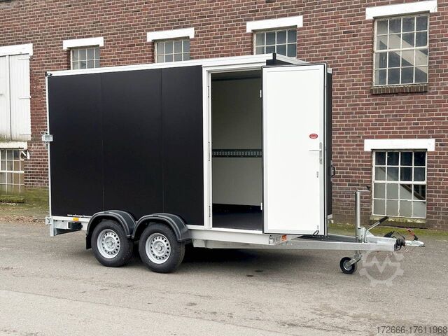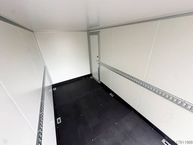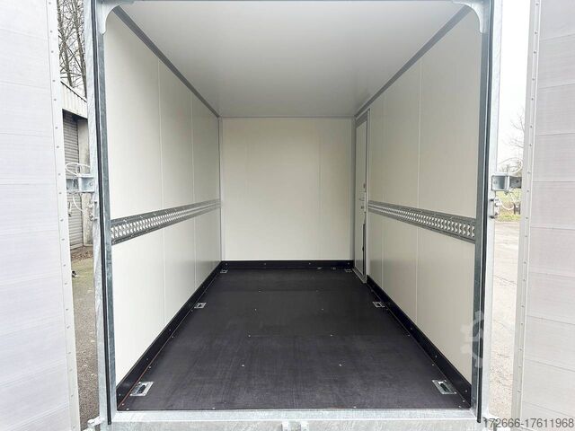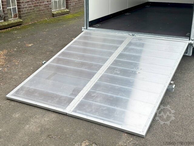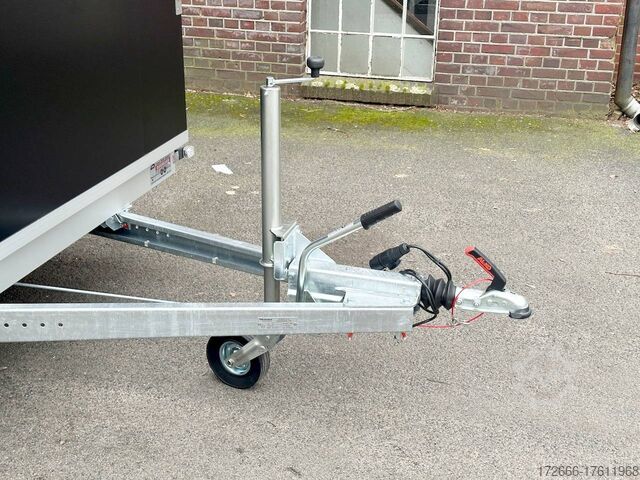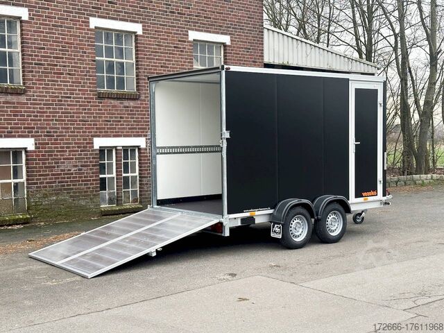 Hydraulics, automatic reverse drive, hot-dip galvanizing, unbraked, ramp & rear door combination! Tandem with sheet steel sandwich body 30mm walls, braked, 2 lashing rails, 6 lashing eyes, * IMMEDIATELY AVAILABLE * Incl. ramp & rear door combination! Tandem with sheet steel sandwich body 30mm walls, braked, 2 lashing rails, 6 lashing eyes Technical data: - Type: New vehicle - TÜV: New/2 years - Availability: IMMEDIATELY! - Gross vehicle weight: 2700kg - Unladen weight: 810 kg - Payload: 1,890 kg - Interior dimensions: 355 x 184 x 205 cm (L x W x H) - Overall exterior dimensions: 521 x 237 x 267 cm (L x W x H) - Loading sill height: 59 cm - Tires: 185R14C steel rim - Brake: yes - Support wheel: yes - 100km/h: at extra charge - incl. vehicle documents Vehicle superstructure: - Floor: Wood, Finnish multiplex board - Walls: 30mm sheet steel sandwich - Roof material: 25mm GRP sandwich - Chassis: ALKO rubber spring axle - Number of lashing eyes: 6 pieces (750kg/daN) - Rear door: yes, double-leaf reversible - Tailgate: yes combination - Tailgate material: aluminum - Tailgate/door function: espagnolette lock - Clearance dimensions tailgate/flap: - Interior light: at extra charge - Supports: at extra charge - Overrun device & brakes: yes Overrun device & brake: yes, - Frame/chassis: V-drawbar, hot-dip galvanized - Lighting plug: 13-pin - Approval: COC papers Standard equipment: - stable V-drawbar, hot-dip galvanized - tandem axle - overrun device from ALKO - floor panel made of Finnish multiplex - side walls made of very solid sheet steel sandwich, 30 mm thick - roof made of GRP sandwich 25mm - 2-leaf rear doors - doors with special sealing profiles, made of hard/soft plastic - stainless steel espagnolette lock and hinges galvanized - rear frame and frame profiles made of special aluminium profiles - 6 lashing points in the floor, 750 kg lashing force - trailer has pre-mounted lashing strip on both sides - automatic jockey wheel - automatic reverse drive - plastic mudguards - 13-pin plug - reversing lights - large rear lights - large rear lights - rear lights - large rear lights - large rear lights. plug - reversing lights - large safety lighting - integrated rear fog light - body: splash-proof - registration papers: COC papers Special equipment included in the price: - Ramp & door combination (aluminum drive-on ramps switchable to hinged doors) - Loading via ramp or also possible with forklift from the rear! Accessories can be retrofitted - please enquire: - anti-theft device - rear supports - 100km/H approval with wheel shock absorber - side door - motorcycle rockers - motorcycle stand rails - motorcycle lashing straps - lashing straps - additional lashing eyes - additional slot-hole rails for lashing straps & locking beams - bar strip with rubber coating for lashing straps & locking beams - steel or aluminum locking beams - interior lights - reversing lights - and much more. New vehicle with warranty and TÜV. We are happy to offer you suitable financing !, Descriptions and pictures are protected by copyright !!! Over 800 trailers immediately available for you! We are for over 30 years Brian James / Humbaur / Hapert / Unsinn / Cheval Liberte / Koch / Debon / Stedele / TPV / Tohaco / Vezeko / Variant / Vlemmix - specialized dealer & repair - workshop - delivery Germany-wide with surcharge possible! Anhänger Zentrum BAUMANN GmbH Dinxperloer Str. 389 46399 Bocholt - Errors, omissions and prior sale excepted -