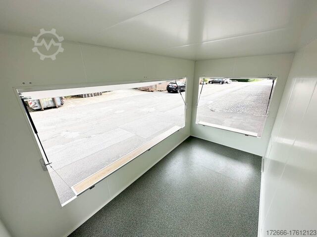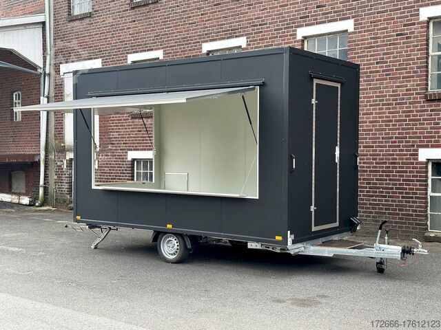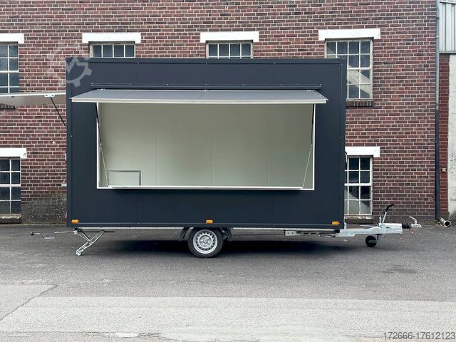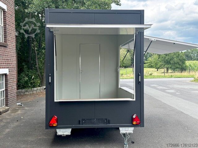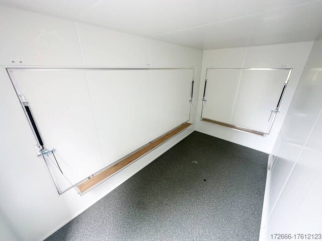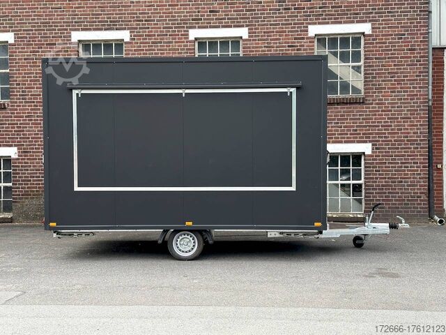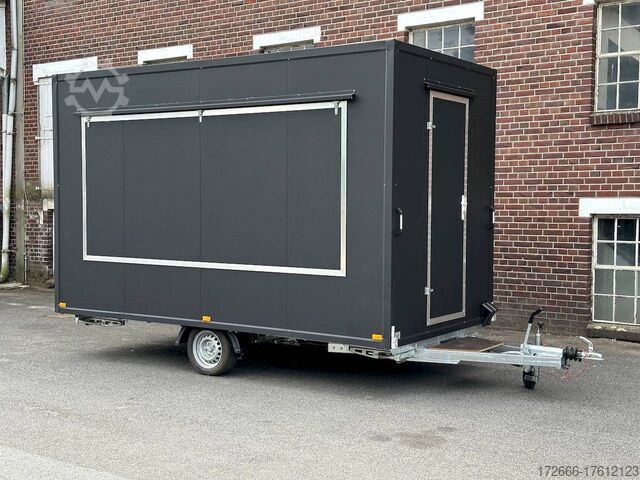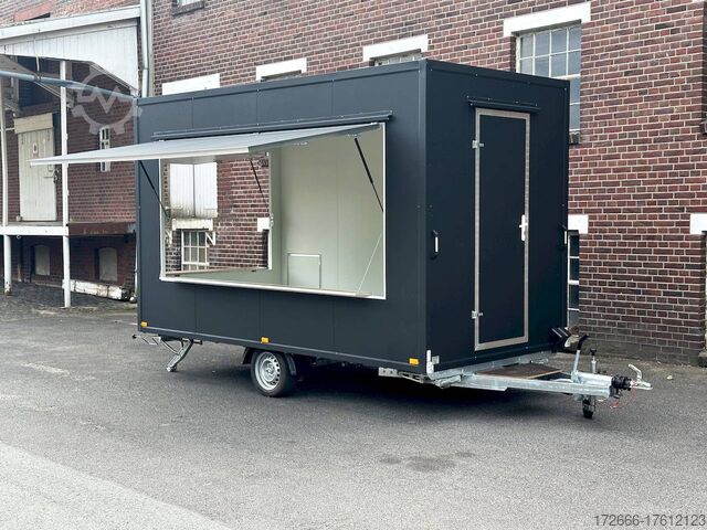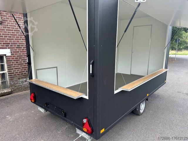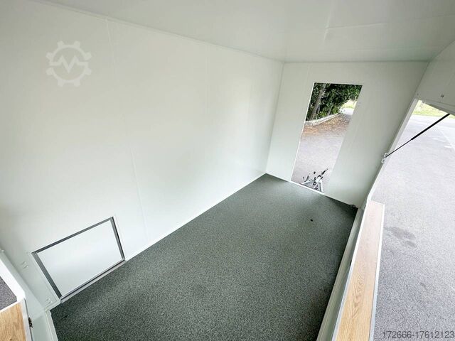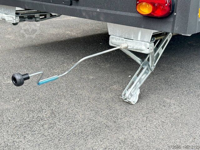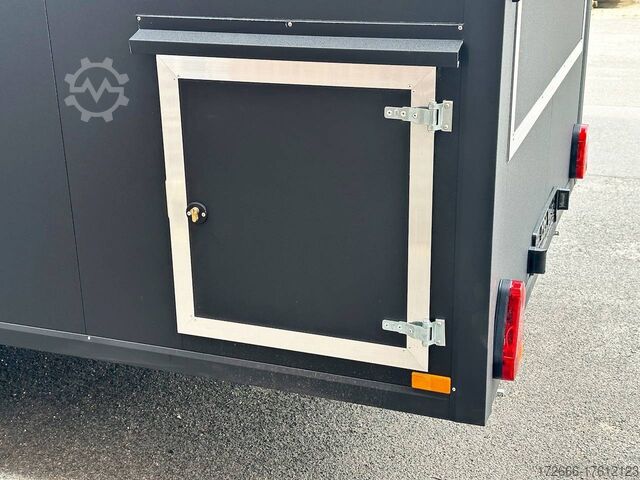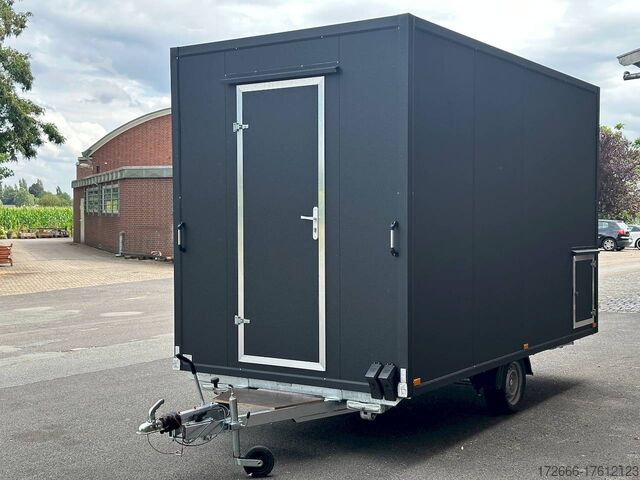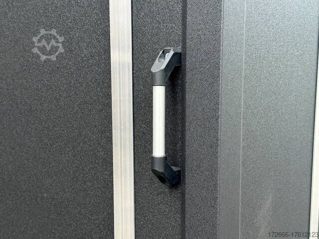 Hydraulics, automatic reverse drive, hot-dip galvanizing, sheet steel sandwich body 40mm walls, braked, PVC floor, 2x sales hatch + bag storage, gas door, * IMMEDIATELY AVAILABLE * Sheet steel sandwich body 40mm walls, braked, PVC floor, 2x sales hatch + bag storage, gas door TECHNICAL DATA - Vehicle type: Box trailer - Vehicle condition: New vehicle - Initial registration: Without initial registration - TÜV/HU: 2 years from initial registration - Interior dimensions (L x W x H): 397 x 196 x 230 cm - Exterior dimensions (L x W x H): 552 x 205 x 294 cm - Floor loading height: 55 cm - Perm. Total weight: 1,500 kg - Unladen weight: 842 kg - Payload: 658 kg - Chassis: High loader (wheels under the body) - Tires: 195/50R13C - Chassis: KNOTT rubber spring axle - Support wheel: Yes, standard with clamp - 100km/h approval: Optional, can be retrofitted Vehicle body: - Brake: Yes - Number of axles: 1 - Floor: Wooden floor - Walls material: Sheet steel sandwich insulated 40mm - Roof material: Sheet steel sandwich insulated 40mm - Colour: Black - Tipping / lowering function: None - Overrun device/brake: KNOTT - Frame/chassis: Welded steel frame - Galvanization: Hot-dip galvanized - Drawbar: V-drawbar - Mudguards: Plastic - Side door: No - Side flap: Yes: right and rear - Rear doors / tailgate: Door in front - Rear door / tailgate material: - - Tailgate load: - - Rear clearance dimension: - - Locks box body: Standard door handle - Drive-on angle: - - Supports: 4x scissor supports, rotatable - Lashing rails: Optional, can be retrofitted - Lashing eyes: Optional, can be retrofitted - Interior light: Optional, can be retrofitted - Rear lighting: Incandescent bulbs, lamps mounted on the rear wall - Side lighting: - - Plug for lighting: 13-pin - Vehicle documents: COC papers Standard equipment: - stable V-drawbar, hot-dip galvanized - single-axle - overrun device from KNOTT - floor plate made of multiplex - side walls made of very solid sheet steel sandwich, 40 mm thick - sales hatch on the right side + bag rack - rear sales hatch + bag rack - PVC covering on the floor - door in the front wall, lockable from the inside and outside - step on the drawbar - support wheel with clamp - 4x scissor supports mounted incl. crank Automatic reverse drive - Plastic mudguards - 13-pin plug - Reversing lights - Large safety lighting - Integrated rear fog light - Registration papers: COC papers Accessories can be retrofitted for an extra charge - please enquire. Theft protection - 100km/H approval with wheel shock absorber - lashing eyes - slotted-hole rails for tension belts & locking bars - bar strip with rubber coating for tension belts & locking bars - aluminum locking bars - interior lights - reversing lights - and much more. New vehicle with warranty and TÜV. We are happy to offer you suitable financing !, Descriptions and pictures are protected by copyright !!! Over 800 trailers immediately available for you! We are for over 30 years Brian James / Humbaur / Hapert / Unsinn / Cheval Liberte / Koch / Debon / Stedele / TPV / Tohaco / Vezeko / Variant / Vlemmix - specialized dealer & repair - workshop - delivery Germany-wide with surcharge possible! Anhänger Zentrum BAUMANN GmbH Dinxperloer Str. 389 46399 Bocholt - Errors, omissions and prior sale excepted -