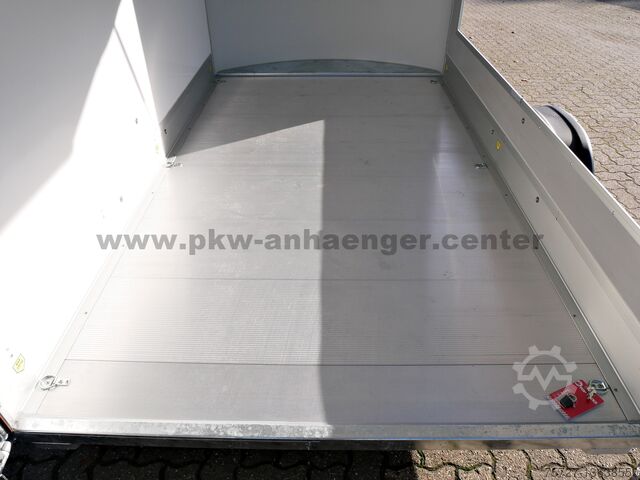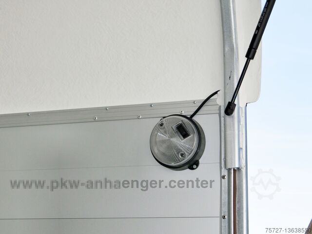 The extensive standard equipment of the *car trailer* includes a *poly roof* and *poly front* in one piece, *sandwich walls*, *aluminum floor*, *side flap*, *folding door system*, *100km/h*, *interior light*, *automatic support wheel*, *towing eyes*, *sturdy frame* and a *V-drawbar*.