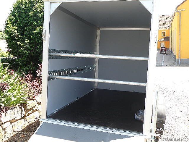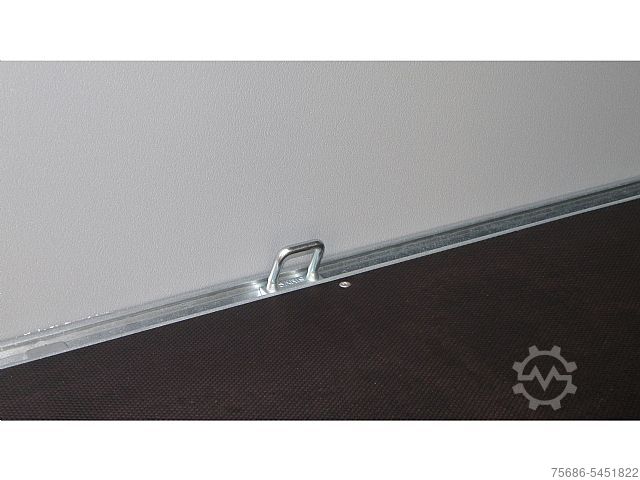 Box trailer braked tandem low loader with wooden body white outside, grey inside, hinged rear doors, lashing brackets on the side in the floor plate, interior lighting, robust welded and hot-dip galvanized steel frame, automatic front wheel, 13-pole electrical system, plastic mudguards