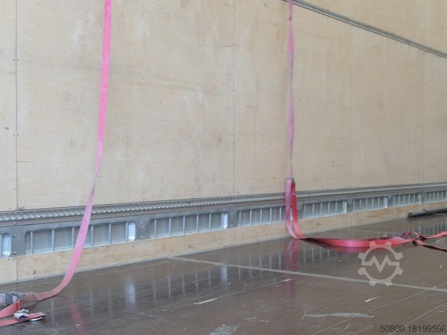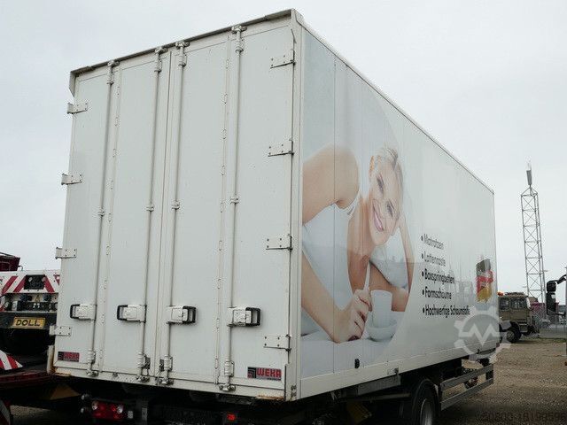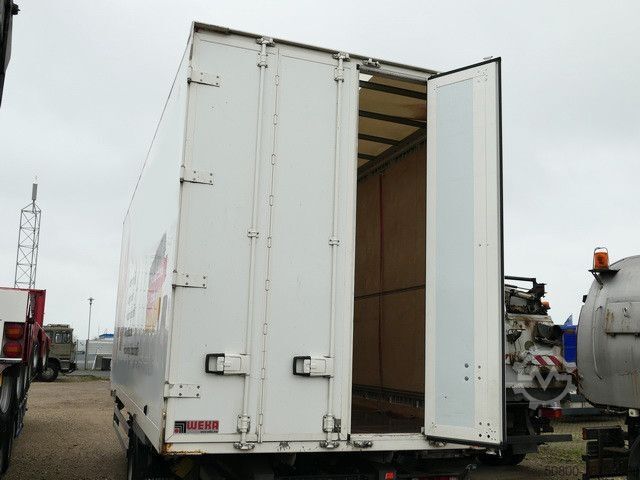 Сменный чемодан, двустворчатая дверь со шпингалетным замком сзади, складная дверь, пол с трафаретной печатью, внутренние стены обшиты фанерой, 2 крепежные планки с каждой стороны, 2 анкерные рейки для запирающих стержней с каждой стороны, легкая крыша, автомобиль можно поставить на стоянку. покрыты рекламой и/или маркированы