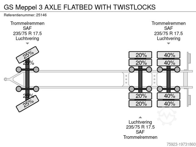Front axle: Twin tires; Steered; Tire profile left inner: 25%; Tire profile left outer: 25%; Tire profile right inner: 25%; Tire profile right outer: 25%