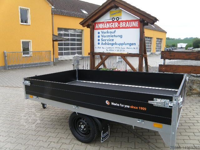 New series ! Two-axle, braked flatbed high loader with low loading area height, aluminium drop sides can be folded down and removed on all sides, welded, hot-dip galvanized steel frame, lashing recesses in the floor on the side in a V-groove, automatic jockey wheel, 13-pole electrical system with reversing light as standard