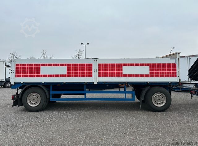 Building material flatbed trailer, loading space dimensions 7,000 mm x 2,480 mm x 950 mm, front wall 1,200 mm, lashing hole strip left and right, length-adjustable towing eye, lifting/lowering valve on the rear axle, duomatic connection, storage box, "SAF" axles with silk brake, LED additional headlights,
