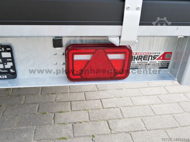The standard equipment of the Anssems flatbed high loader with brake includes black aluminum side panels, all foldable and removable, black rims, storage box, LED lighting, sturdy eccentric locks, lashing eyes on the outside and inside, profile channels for attaching accessories or load securing, very stable welded steel frame, pull-out supports for tailgate, support wheel and a V-drawbar.