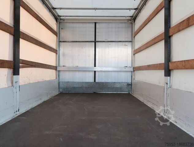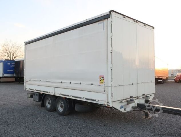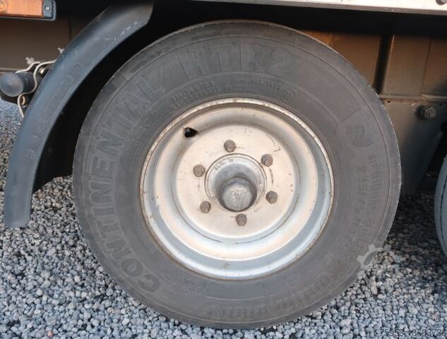 ABS, axle manufacturer BPW, through-loading capability, 3 rows of plug-in boards, color white, air/air suspension, portal door, spare wheel with holder, drum brake, storage box 1, lashing eyes 18, portal doors front and rear, 2-speed geared support winch, sliding tarpaulin left/right, side walls, 2x rear support