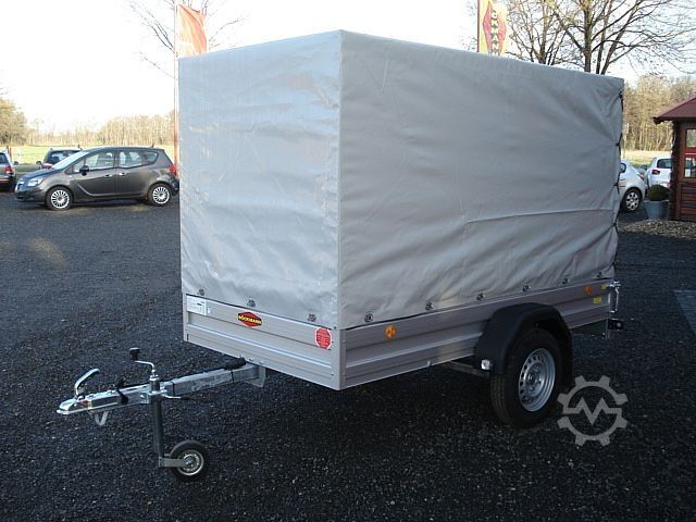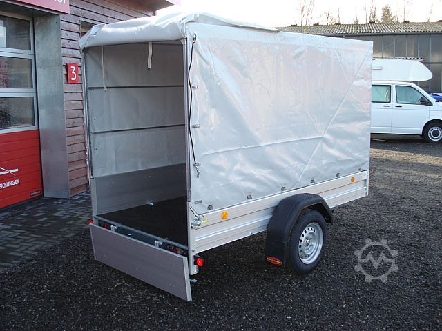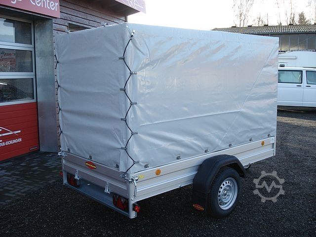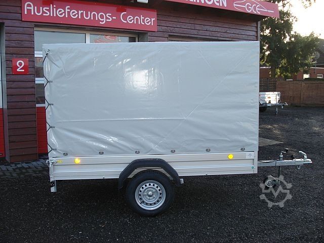 High tarpaulin (1,200 mm in gray) and bows, aluminum side walls, screen-printed floor plate, 13-pin plug, support wheel, 14-inch wide tires, sliding supports at the rear