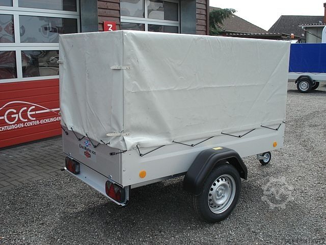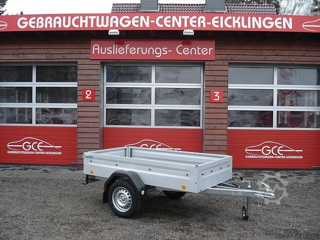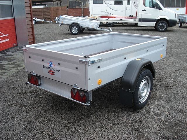 Equipment: bows, high tarpaulin (gray or blue) 800 mm, steel side walls, screen printing floor plate, 13-pin plug, V-drawbar, support wheel, unbraked, safety rope against trailer loss