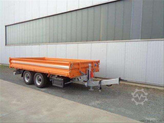 Sturdy tipper body with 4 mm sheet steel floor, steel side wall structure, continuous side walls, hinged and pivoted with central locking at the bottom. Rear corner stanchions pluggable. Rear wall can be folded down and pivoted, with central locking at the bottom.