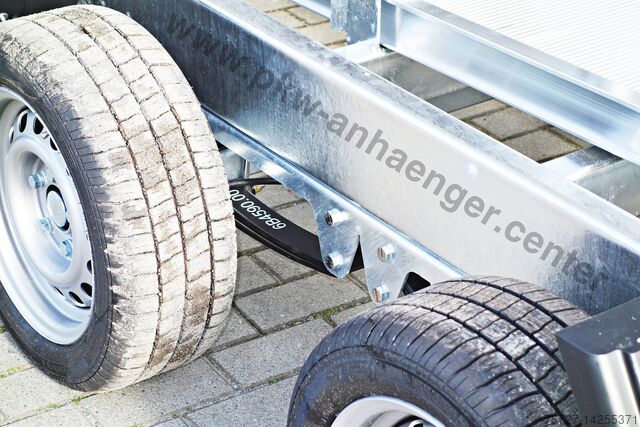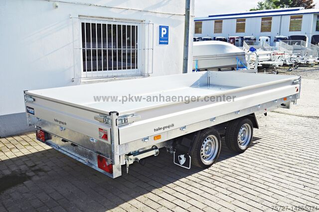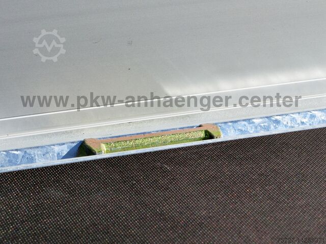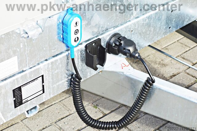 Built with an extremely sturdy hot-dip galvanized steel frame, solid steel floor, slide-in ramps under the loading area, crankable rear support set, parabolic suspension with shock absorbers and 100 km/h, electro-hydraulics with battery in the container with cover, removable illuminated control unit, double-walled anodized aluminium side walls, all walls are foldable and removable, easy-to-operate eccentric locks, low chassis with 195/50R13C tyres, lashing eyes with 1000kg load capacity, net hooks, steel plate on wooden floor, automatic support wheel and a reinforced V-drawbar.