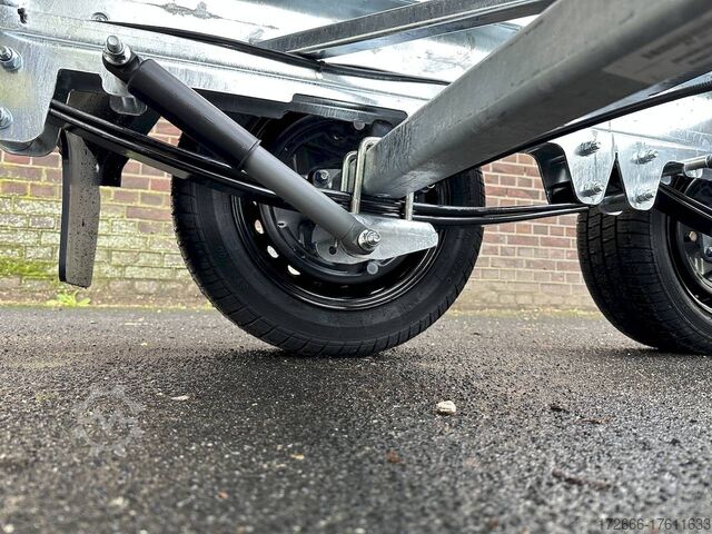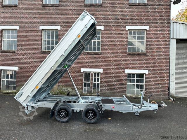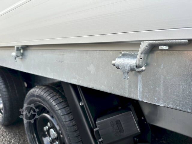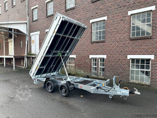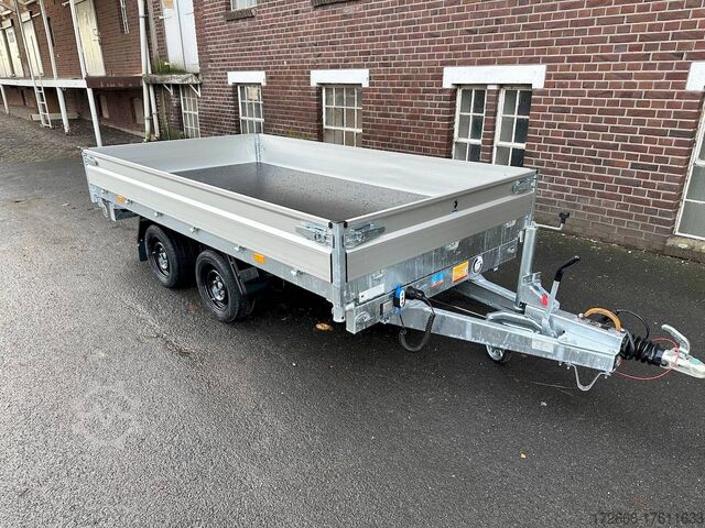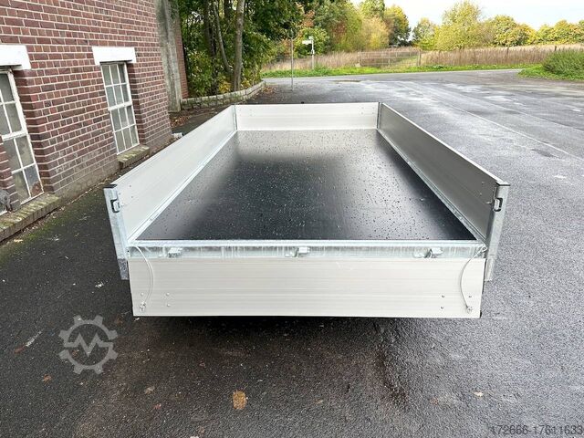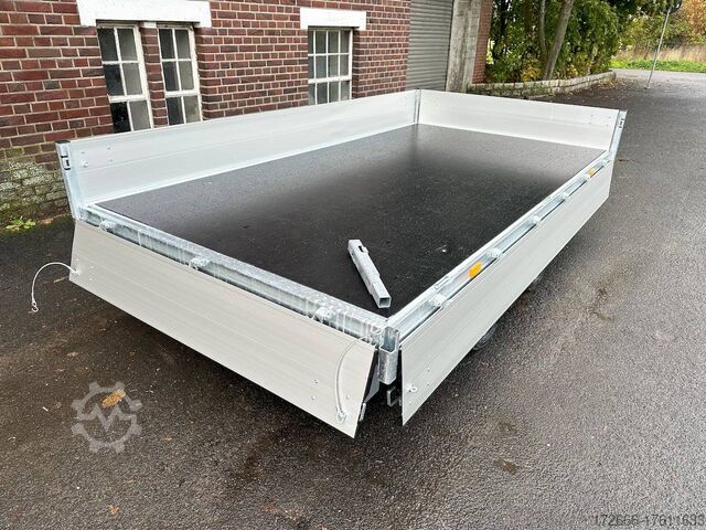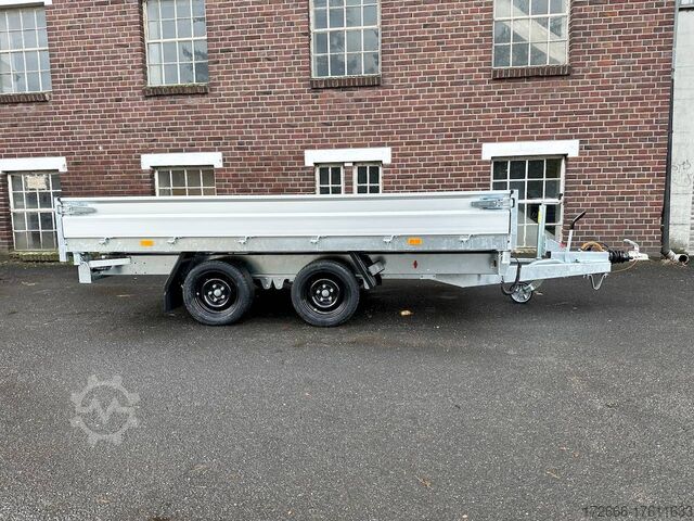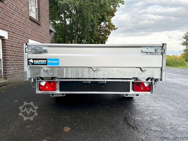 Hydraulics, automatic reverse drive, hot-dip galvanizing, roof window, incl. composite floor (ultra-reinforced honeycomb core floor) - extremely resilient and durable, * IMMEDIATELY AVAILABLE * incl. composite floor (ultra-reinforced honeycomb core floor) - extremely resilient and durable! Technical data: - Type: New vehicle with 2 years TÜV from first registration - Availability: Immediately available!!! - TÜV: 2 years - Floor: composite floor - Gross vehicle weight: 3,500 kg - Unladen weight: 844 kg - Payload: 2,656 kg - Internal dimensions: 335 x 180 x 30 cm (L x W x H) - External dimensions: 468 x 186 x 99 cm - Loading sill height: 69 cm - Tires: 195/50R13C steel rim - Brake: yes - Support wheel: yes, automatic 500 kg - Incl. vehicle documents (letter) Vehicle documents (letter) - 100 km/h: at extra charge Standard equipment: - New dropside hinges incl. very simple attachment option for a cargo net, among other things. - Anodized double-walled aluminium drop sides - All drop sides foldable all round - All drop sides removable - Sturdy welded steel frame - Frame completely hot-dip galvanized - Many sturdy cross members for high point loading - Additional longitudinal struts welded in throughout - 6 lashing brackets recessed inside the side edge (1000DaN/kg) TÜV-certified - Lashing hooks on the frame - Automatic reverse drive - KNOTT overrun device and parking brake - Sturdy eccentric locks - Reinforced, V-drawbar - 13-pin plug - reversing lights Plug - Reversing lights - Large safety lighting - Integrated rear fog light - Lighting recessed in rear frame - Automatic center support wheel incl. Special equipment: - Parabolic suspension incl. shock absorber for 100 km/h fitted instead of rubber-sprung axles. - Parabolic spring axle with shock absorber for absolute driving comfort! - Composite floor (honeycomb core plastic floor) Composite is made up of various layers of these fibers, like a kind of lasagne. These two materials create a sustainable, extremely stable and lightweight board. The core of the composite floor consists of a honeycomb structure with a top layer on both sides. The whole is fused together to create a stable unit. The manufacturer of the composite panels comes from the anti-ballistic industry. The top layer is therefore constructed like that of a bulletproof vest. At HAPERT Aanhangwagens, all innovations are extensively tested. This naturally also applies to the new composite floor. It has been thoroughly tested by us under normal conditions of use for impact and tensile strength, shear force, wear and resistance to weather conditions, among other things. Take a look at the load test: ?v=_gpat0vbiTc Accessories optionally available: - Emergency hand pump mounted with electric operation (at extra charge) - Drive-on package: 2x aluminum drive-on rails integrated reinforced - 2 rotating crank supports reinforced version - Car2Trailer charging system (permanent charging of the battery in the tipper via towing vehicle) - High grille at the front, 70cm - Tarpaulin + bows in various heights, - Supports, grille, grids, bows in various heights, - Tiltable cover + bows in various heights, - Support, grille, bows, bows in various heights. Supports, grids, side wall attachments, nets etc. New vehicle with warranty and TÜV. We are happy to offer you suitable financing !, Descriptions and pictures are protected by copyright !!! Over 800 trailers immediately available for you! We are Brian James / Humbaur / Hapert / Unsinn /