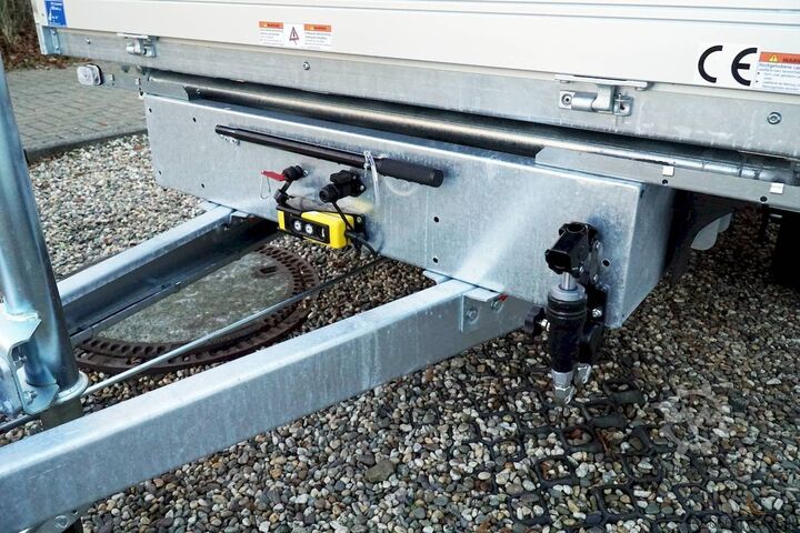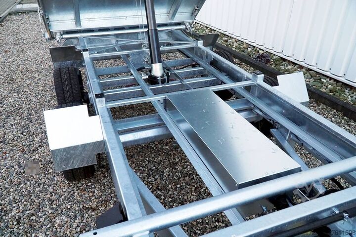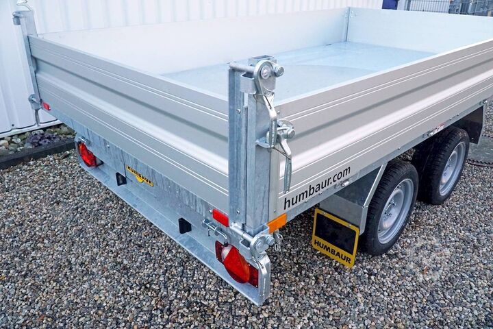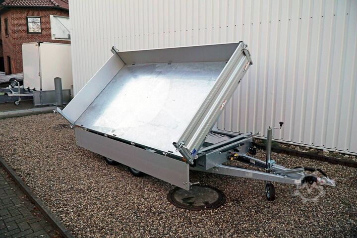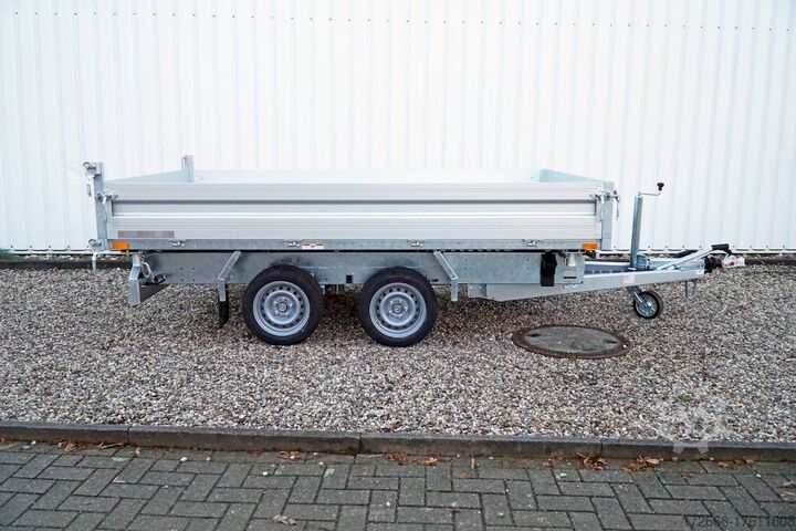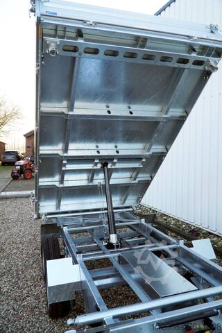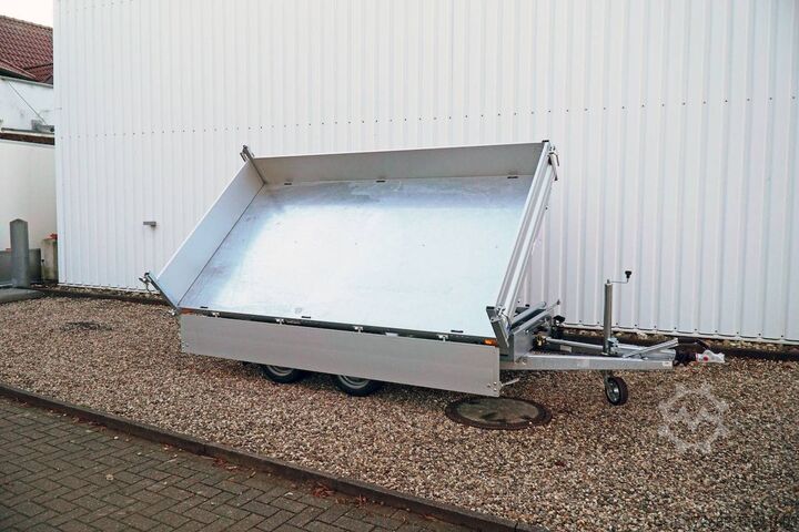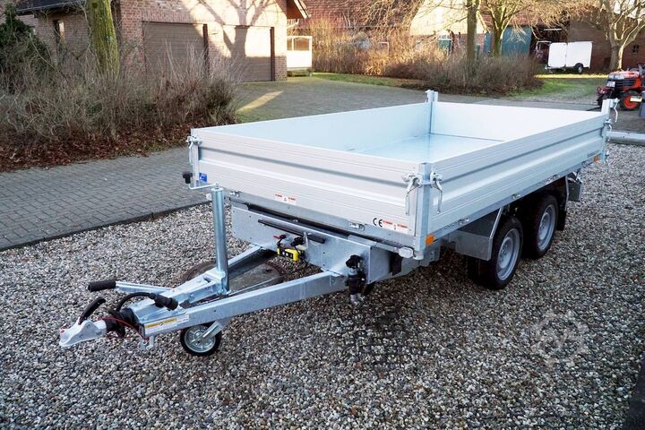 E-hydraulics / emergency hand pump / full steel floor, automatic reversing, hot-dip galvanizing, roof window, * IMMEDIATELY AVAILABLE * incl. E-hydraulics / emergency hand pump / full steel floor Technical data: - Type: New vehicle - TÜV: New/2 years - Availability: IMMEDIATELY! - Gross vehicle weight: 3,000 kg - Unladen weight: 870 kg - Payload: 2,130 kg - Interior dimensions: 314 x 175 x 35 cm (L x W x H) - Overall exterior dimensions: 450 x 193 x 126 cm (L x W x H) - Loading sill height: 75 cm - Tyres: 195/50R13C steel rim - Brake: yes - Support wheel: yes, automatic - 100 km/h: at extra charge - incl. vehicle documents Vehicle superstructure: - incl. electric hydraulic pump - incl. electric hydraulic pump Vehicle documents Vehicle superstructure: - Floor: solid steel floor, solidly reinforced - Side walls: anodized aluminium double-walled, 4x folding & removable - Side wall height: 35cm - Chassis: high loader, ALKO rubber spring axle - Tipping function: yes, three-sided - Hydraulics: electric & emergency hand pump tipping - Tipping angle: approx. 45 - Steps hydraulic cylinder: 3 steps - Overrun device & brake: ALKO - Frame/chassis: welded hot-dip galvanized steel frame - Attachment: at extra charge - Lashing eyes: 6 pieces in the floor (800kg/daN) - Supports: at extra charge - Ramps: at extra charge Standard equipment: - Anodized double-walled aluminium drop sides - Drop sides can be folded to the side and rear - Removable drop sides - Tailgate can also be swivelled - Full steel floor - Extremely robust - Very sturdy welded steel frame - Frame completely hot-dip galvanized - Many options available - Many options available - Many options available - Many options available - Many options available. hot-dip galvanized - many sturdy cross members for high point loading - additional longitudinal struts welded in throughout - electric hydraulics for tipping with battery in the box and cover - 71AH battery - battery is charged via 13-pin plug from the towing vehicle (provided all pins of the socket are connected) - external battery charging socket for 230V charger - emergency hand pump, for manual tipping when the battery is empty - lashing hooks welded to the bottom of the frame - automatic reversing system - ALKO overrun device and parking brake - ramp rail shaft as preparation for aluminum rails for easy retrofitting - sturdy angle lever locks - very sturdy bolted V-drawbar REINFORCED - 13-pin plug - reversing lights - large reversing lights plug - reversing lights - large safety lighting - integrated rear fog light - lighting recessed in rear frame - automatic center support wheel - registration papers: ZBII and COC papers Accessories can be retrofitted - please enquire: - 100km/h approval with shock absorbers - side wall attachment - corrugated grid attachment 60cm - closed sheet metal attachment 60cm - spare wheel - storage box - battery - 230V charger - rear supports - ramps - flat tarpaulin - net hooks - additional lashing eyes - slotted-hole rails for tension belts & locking beams - bar strip with rubber coating for tension belts & locking beams - reversing lights - lashing straps - and much more. New vehicle with warranty and TÜV. We are happy to offer you suitable financing !, Descriptions and pictures are protected by copyright !!! Over 800 trailers immediately available for you! We are for over 30 years Brian James / Humbaur / Hapert / Unsinn / Cheval Liberte / Koch / Debon / Stedele / TPV / Tohaco / Vezeko / Variant / Vlem