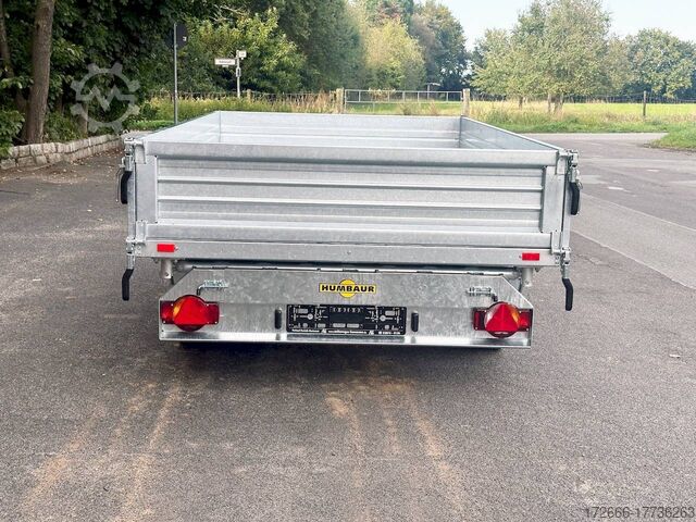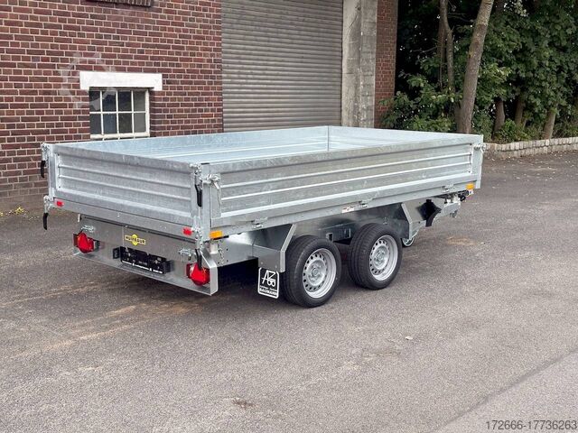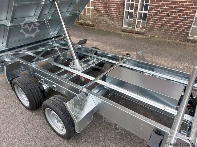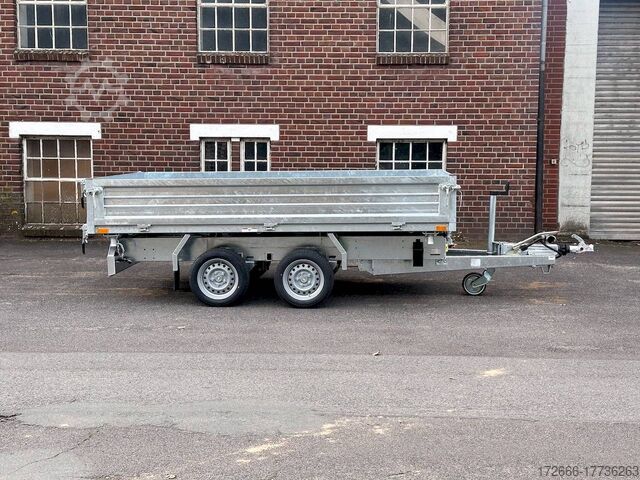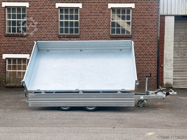 E-hydraulics / Fuhrmann full steel drop sides / emergency hand pump / full steel floor, automatic reverse drive, hot-dip galvanizing, roof window, * IMMEDIATELY AVAILABLE * incl. E-hydraulics / Fuhrmann full steel drop sides / emergency hand pump / full steel floor Technical data: - Make: Humbaur - Model: HTK 3000.31 - Vehicle type: Three-way tipper - Vehicle condition: New vehicle - Initial registration: Without initial registration - TÜV/HU: 2 years from initial registration - Internal dimensions (L x W x H): 313 x 174 x 40 cm - External dimensions (L x W x H): 455 x 191 x 126 cm - Loading height of floor: 75 cm - Gross vehicle weight: 3,000 kg - Unladen weight: 940 kg - Payload: 2.060 kg - Chassis: High loader (wheels under the body) - Tyres: 185R14C - Chassis: ALKO rubber spring axle - Support wheel: Yes, automatic - 100 km/h approval: Optional, can be retrofitted DESCRIPTION - Double-walled steel drop sides - All drop sides can be folded and removed - Steel corner stanchions can be removed - Rear flap can also be swiveled - Insertion option at all 4 corners for tarpaulin frames, lattice attachment, drop side attachments or front wall extension - Sturdy angle lever locks - Full steel floor - Extremely robust - Very sturdy bolted V-drawbar REINFORCED - Very sturdy welded steel frame - Frame completely hot-dip galvanized - Many options for attaching tarpaulin frames, lattice attachments, drop side attachments or front wall extensions. hot-dip galvanized - many cross beams therefore high point load - additional longitudinal struts welded in throughout - E-hydraulics for tipping with battery in the box and cover - 71AH battery - battery is charged via 13-pin plug from the towing vehicle (provided all pins of the socket are occupied) - external battery charging socket for 230V charger - emergency hand pump, for manual tipping when the battery is empty - 6 lashing brackets recessed inside the side edge (800DaN/kg) TÜV certified! - Solid 4-stage hydraulic cylinder - Maintenance-free rubber spring axles from ALKO - Automatic reverse drive - ALKO overrun device and parking brake - Drive-on rail shaft as preparation for aluminum rails for easy retrofitting - 13-pin plug - Reversing lights - Large dimensioned safety lighting - Integrated rear fog light - Lighting recessed in rear frame - Automatic support wheel in the middleaccessories can be retrofitted - please enquire: - 100km/h approval with shock absorbers - side wall attachment - corrugated grid attachment 60cm - closed sheet metal attachment 60cm - spare wheel - storage box - battery - 230V charger - rear supports - ramps - flat tarpaulin - net hooks - additional lashing eyes - reversing lights - lashing straps - and much more. New vehicle with warranty and TÜV. We are happy to offer you suitable financing !, Descriptions and pictures are protected by copyright !!! Over 800 trailers immediately available for you! We are for over 30 years Brian James / Humbaur / Hapert / Unsinn / Cheval Liberte / Koch / Debon / Stedele / TPV / Tohaco / Vezeko / Variant / Vlemmix - specialized dealer & repair - workshop - delivery Germany-wide with surcharge possible! Anhänger Zentrum BAUMANN GmbH Dinxperloer Str. 389 46399 Bocholt - Errors, omissions and prior sale excepted -
