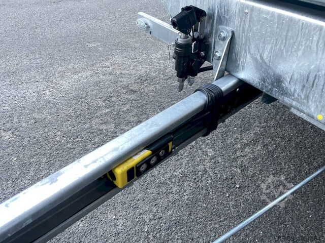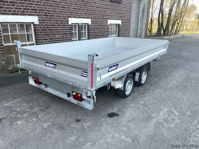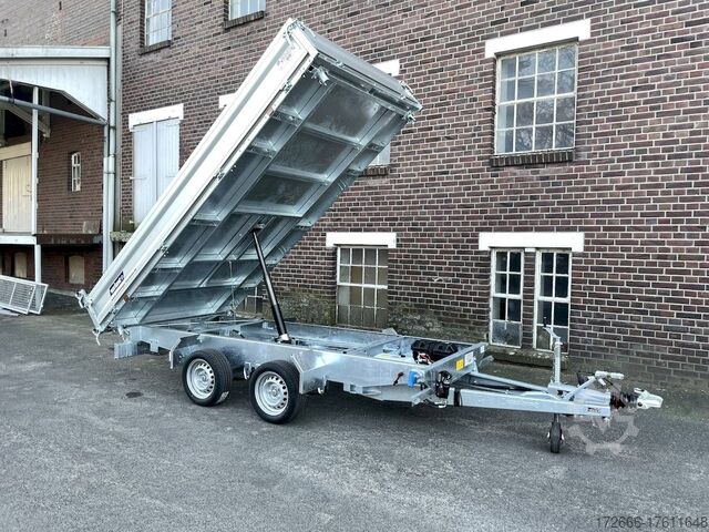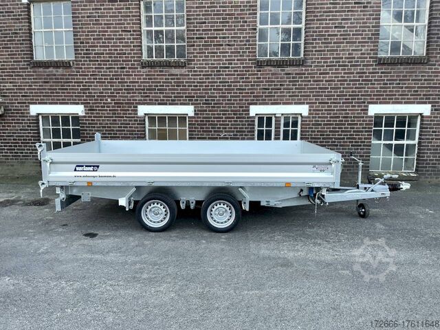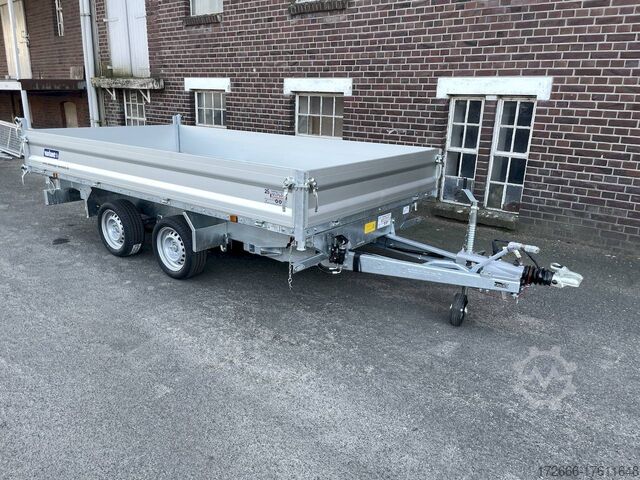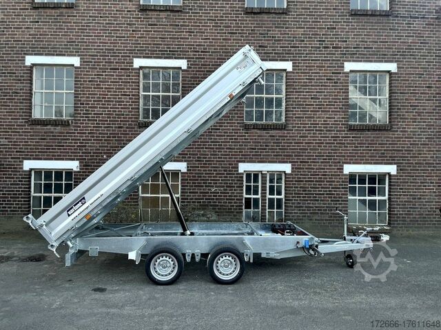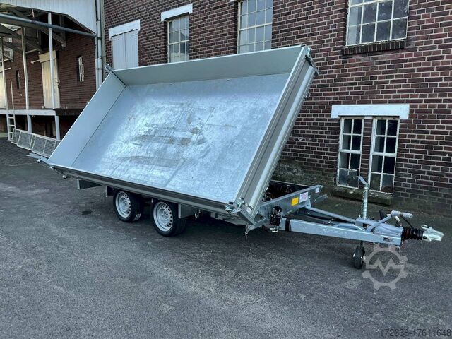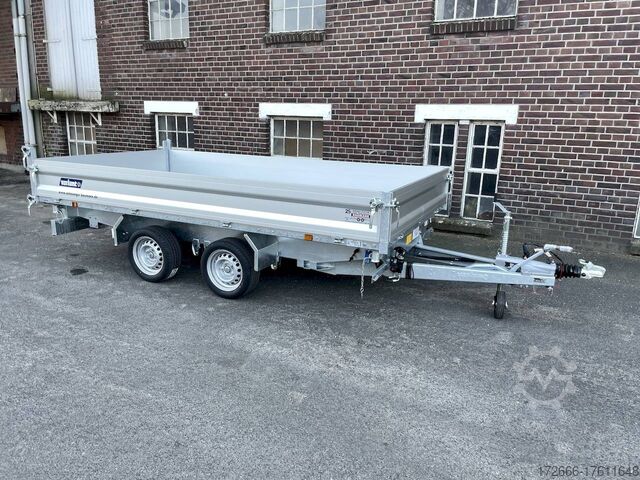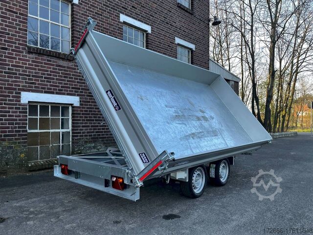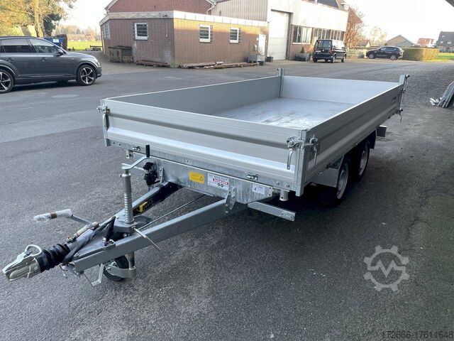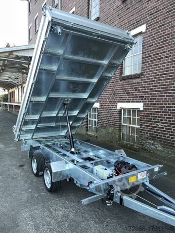 E-hydraulics / emergency hand pump / parabolic suspension / full steel floor / charger, automatic reverse drive, hot-dip galvanizing, roof window, * IMMEDIATELY AVAILABLE * incl. E-hydraulics / emergency hand pump / parabolic suspension / full steel floor / charger Technical data: - Type: New vehicle - TÜV: New/2 years - Availability: IMMEDIATELY! - Gross vehicle weight: 3,500 kg - Unladen weight: 1,020 kg - Payload: 2,480 kg - Interior dimensions: 361 x 185 x 35 cm (L x W x H) - Overall exterior dimensions: 514 x 200 x 118 cm (L x W x H) - Loading sill height: 72 cm - Tires: 195/50R13C steel rim - Brake: yes - Support wheel: yes, automatic - 100 km/h: optional! - incl. vehicle documents Vehicle superstructure: - Floor: solid steel floor, solidly reinforced - Drop sides: anodized aluminium double-walled, 4x folding & removable - Drop side height: 35cm - Chassis: high loader, KNOTT parabolic spring axle - Tipping function: yes, three-sided - Hydraulics: electric & tiltable with emergency hand pump - Tipping angle: approx. 45 / 47 - Steps hydraulic cylinder: 4 steps - Overrun device & brake: KNOTT - Frame/chassis: Welded hot-dip galvanized steel frame - Attachment: at an extra charge - Lashing eyes: 8. Ramps: at extra charge - Lighting plug: 13-pin - Approval: COC papers Standard equipment: - Anodized double-walled aluminium drop sides - Drop sides can be folded to the side and rear - Removable drop sides - Rear flap can also be swivelled - Solid steel floor - Extremely robust - Very sturdy welded steel frame - Frame completely hot-dip galvanized - Many options available - Many options available. hot-dip galvanized - many sturdy cross members for high point loading - additional longitudinal struts welded in throughout - e-hydraulics for tipping with battery in the box and cover - built-in battery - integrated battery charger, and charge level indicator - emergency hand pump fitted - automatic reverse drive - parabolic spring axles (leaf spring suspension) - KNOTT overrun device and parking brake - ramp shaft as preparation for ramps - sturdy angle lever locks - very sturdy bolted V-drawbar STRENGTHENED - 13-pin plug - reversing lights - large reversing lights plug - reversing lights - large safety lighting - integrated rear fog light - lighting recessed in rear frame - automatic center support wheel - registration papers: COC papers Accessories can be retrofitted - please enquire: - 100km/h approval - corrugated grid attachment 60cm - closed sheet metal attachment 60cm - spare wheel - storage box - rear supports - ramps - flat tarpaulin - net hooks - additional lashing eyes - reversing lights - lashing straps - and much more. New vehicle with warranty and TÜV. We are happy to offer you suitable financing !, Descriptions and pictures are protected by copyright !!! Over 800 trailers immediately available for you! We are for over 30 years Brian James / Humbaur / Hapert / Unsinn / Cheval Liberte / Koch / Debon / Stedele / TPV / Tohaco / Vezeko / Variant / Vlemmix - specialized dealer & repair - workshop - delivery Germany-wide with surcharge possible! Anhänger Zentrum BAUMANN GmbH Dinxperloer Str. 389 46399 Bocholt - Errors, omissions and prior sale reserved -