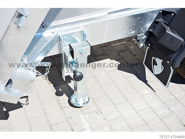 Extremely stable hot-dip galvanized steel frame, parabolic suspension with shock absorber, loading rails, rear support set, 100 km/h, electro-hydraulics with battery, battery box with cover, removable illuminated control unit, double-walled anodized aluminium side walls, all walls are foldable and removable, easy-to-operate eccentric locks, low chassis with 195/50R13C tires, lashing eyes 1000kg load capacity, net hooks, solid steel floor, automatic support wheel and a reinforced V-drawbar.