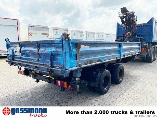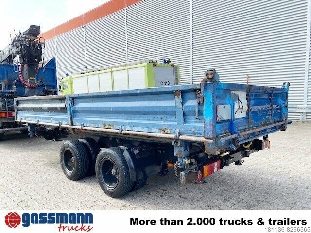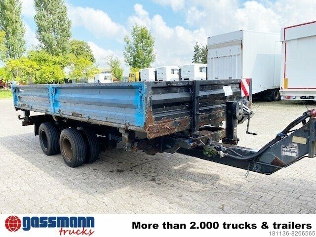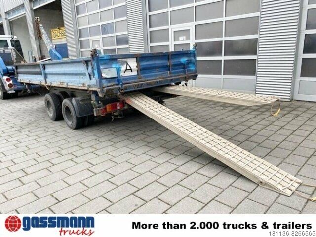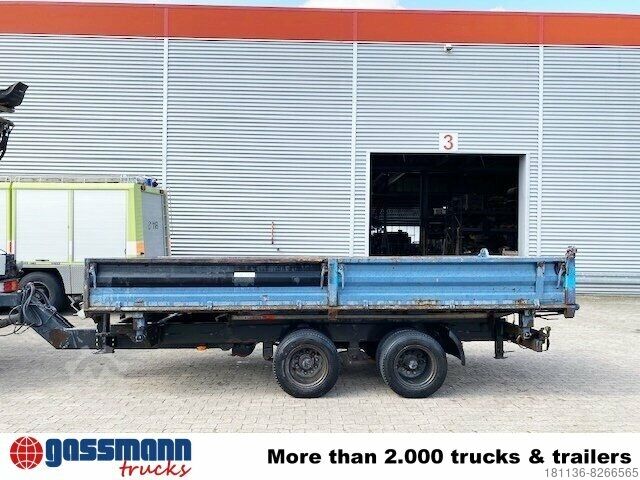 Body: 3-sided tipper trailer with access ramps, steel drop sides can be folded down, 40 mm towing eye, drum brakes, center and corner stanchions plugged in,